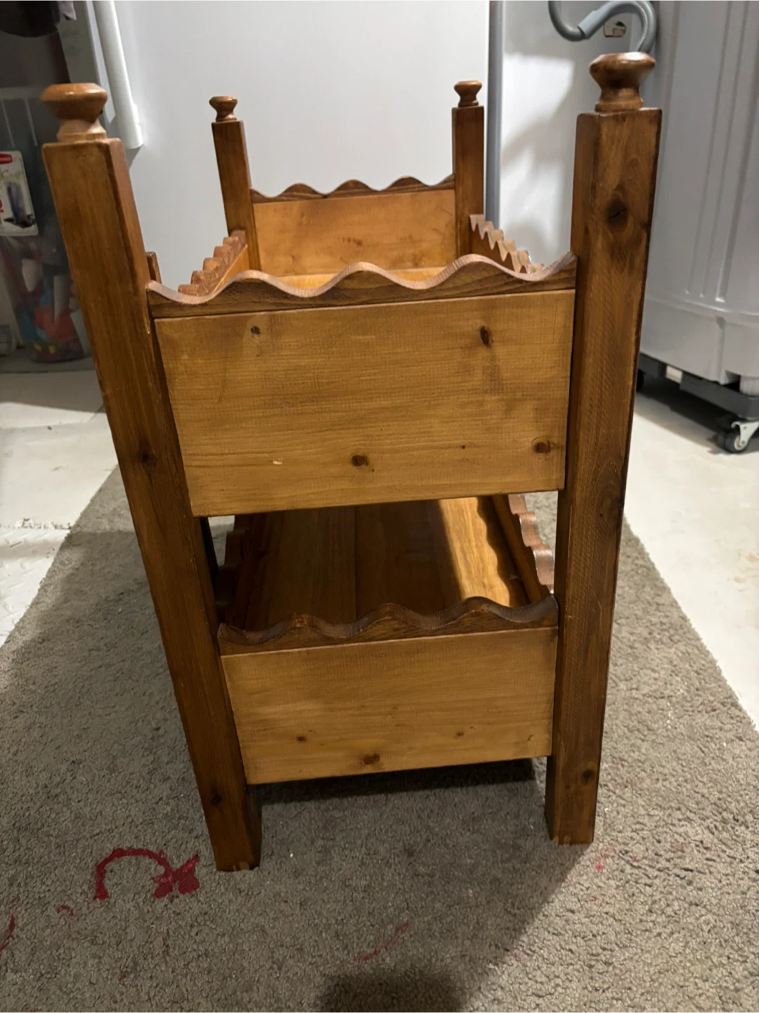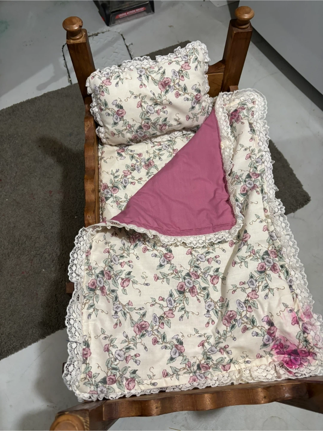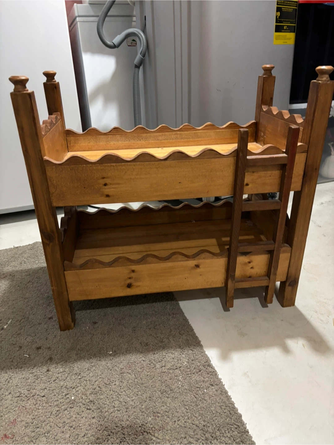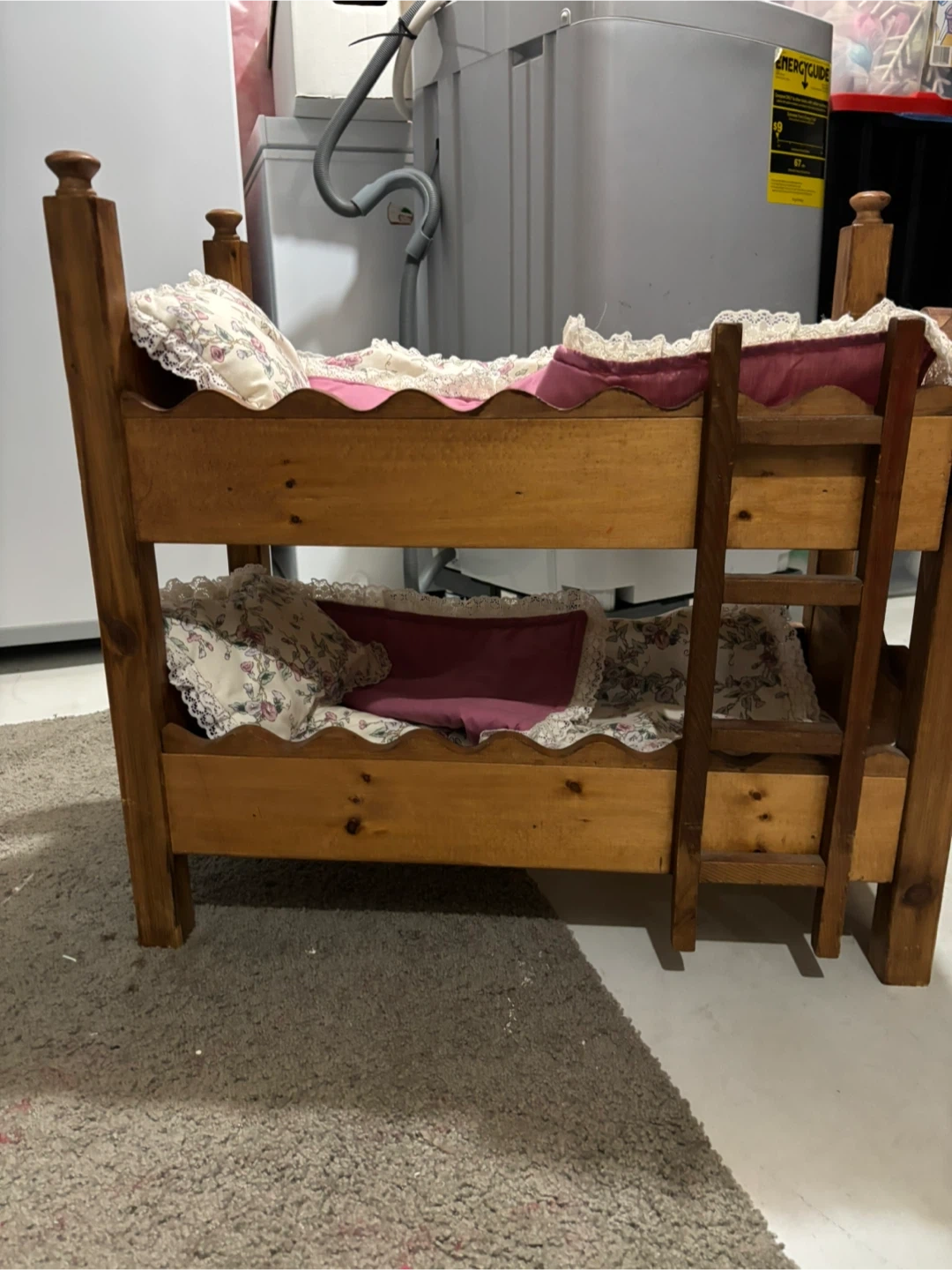 This is a lovely handcrafted wooden bunk bed designed for dolls. It comes with a floral patterned duvet, bed pad and pillow.