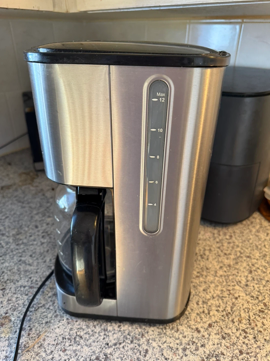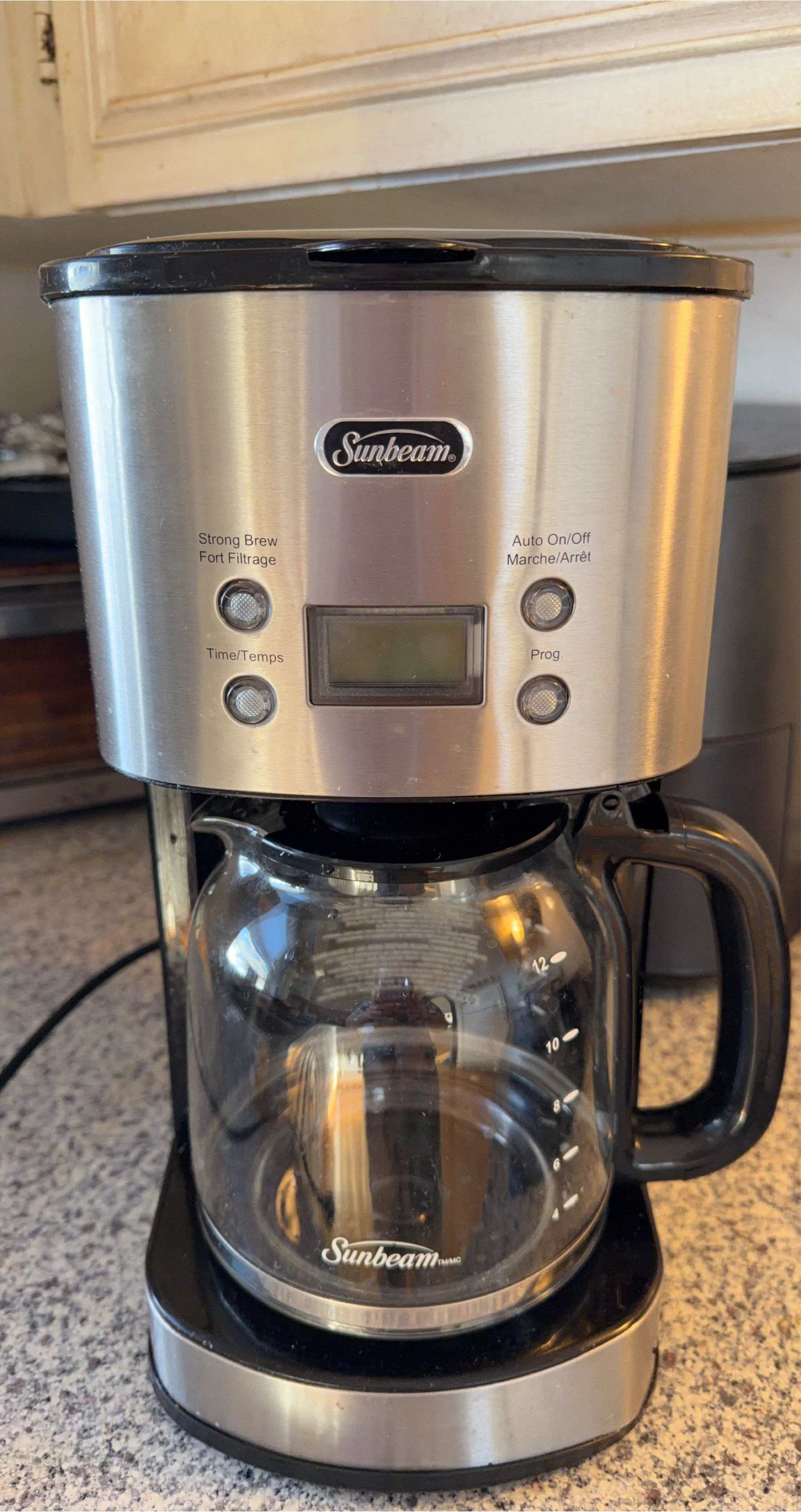 This Sunbeam coffee maker brews up to 12 cups. It has a programmable auto shut-off and a strong brew option. The carafe is made of glass with clear measurement markings.