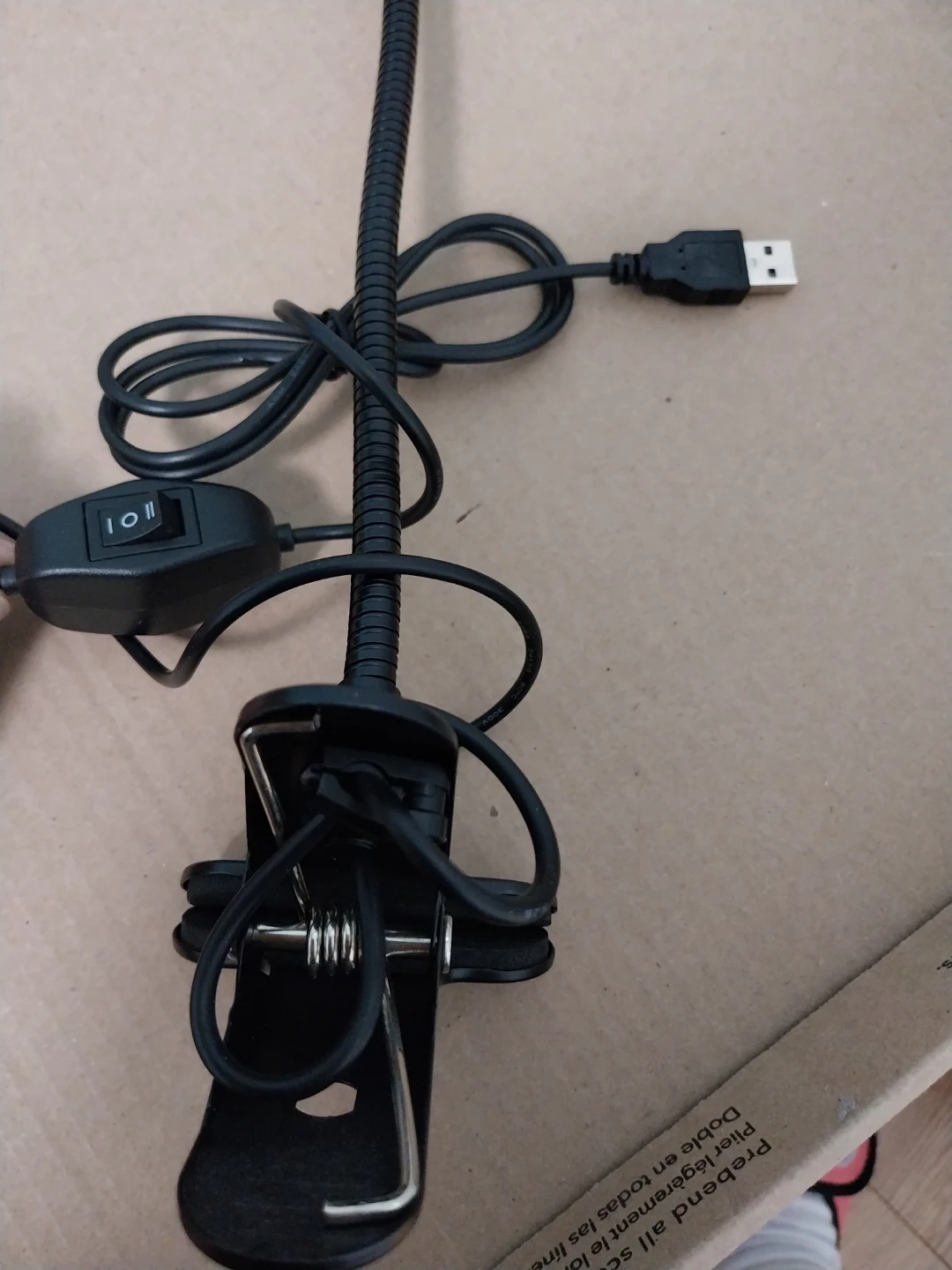 This clip-on ring light offers adjustable lighting. It's powered by a USB cable and features a flexible gooseneck design. A handy on/off switch with 2 power settings is located on the cord.