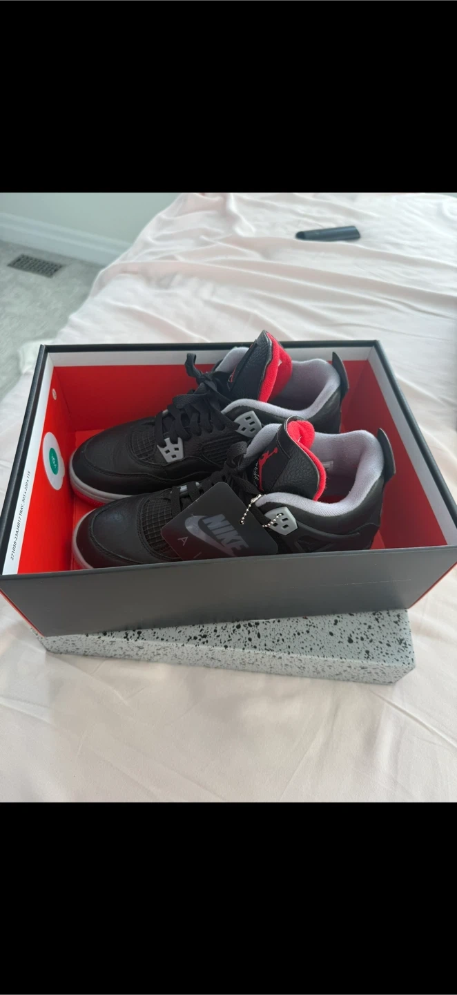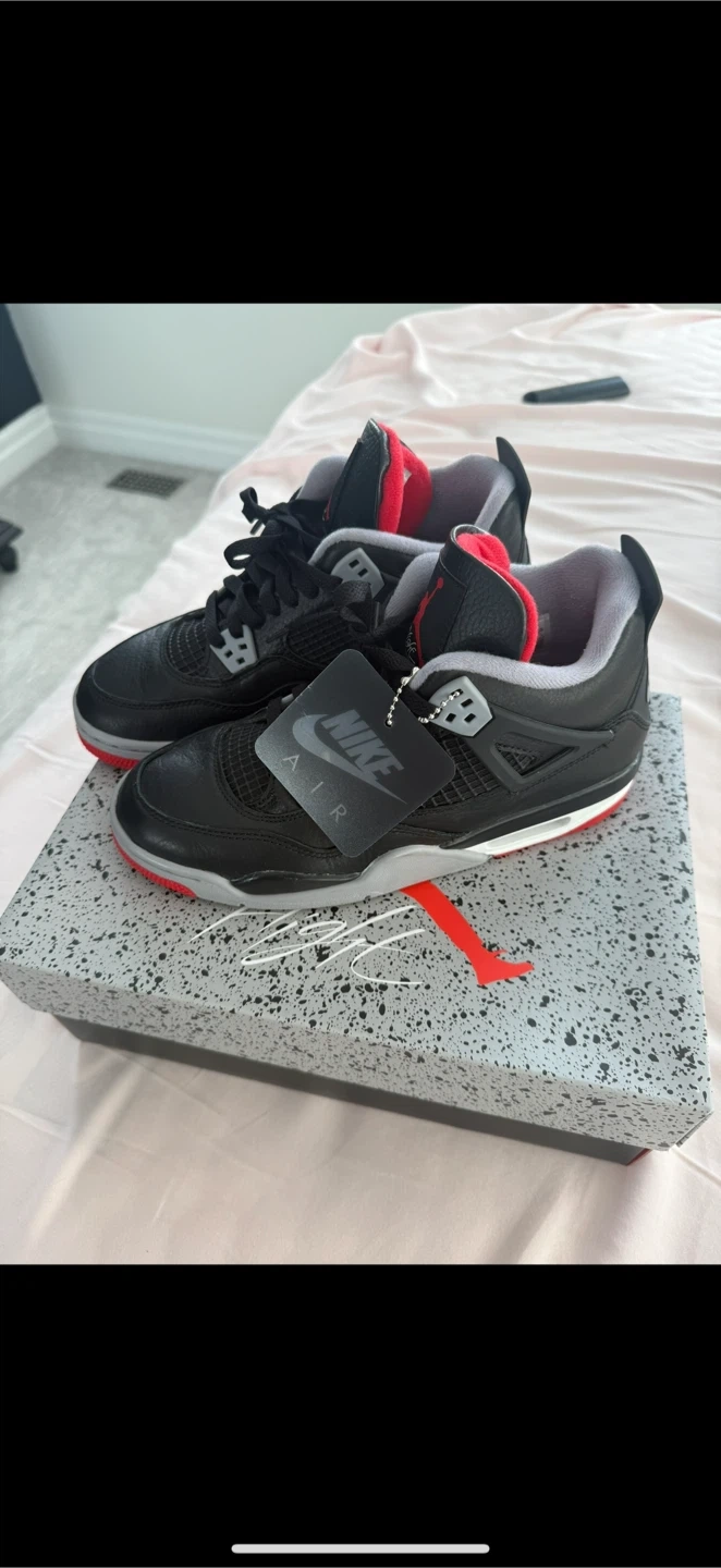 Air Jordan 4 Retro Bred Reimagined sneakers. Men's US size 6.5. Comes with original box and tags. Black leather with red and grey accents.