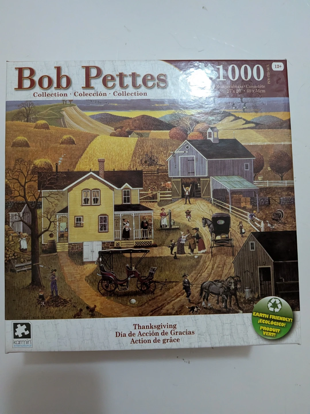 Bob Pettes Thanksgiving 1000 piece jigsaw puzzle. Finished size 27 x 20 inches (69 x 51cm). Made by Karmin International. It's suitable for ages 12 and up.