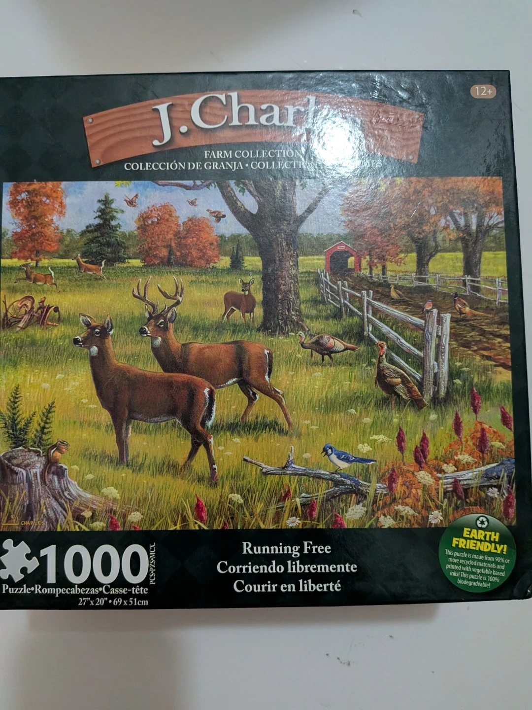 This J. Char 1000-piece puzzle features a farm scene called 'Running Free'. It measures 27" x 20" (69 x 51cm). The puzzle is made from 90% or more recycled materials and printed with vegetable-based inks, making it 100% biodegradable. It's recommended for ages 12+.