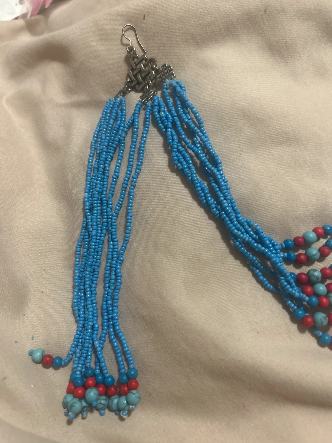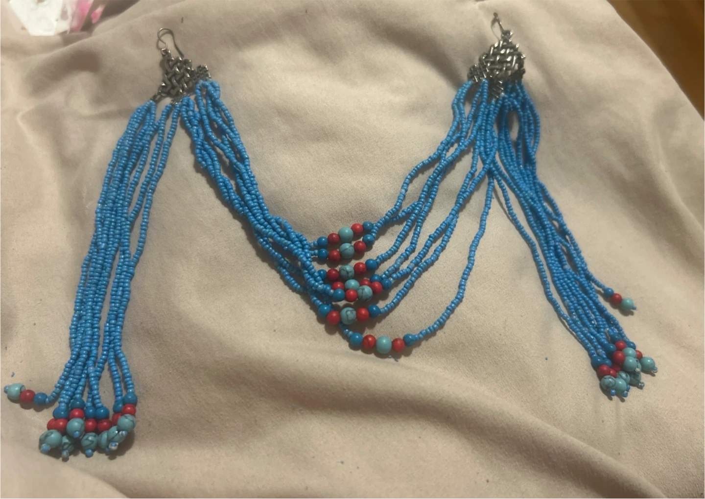 Boho-style dangle earrings featuring multiple strands of small blue beads. Accented with red and turquoise bead details. Secured with silver-toned fishhook closures.