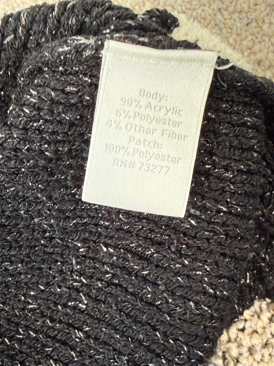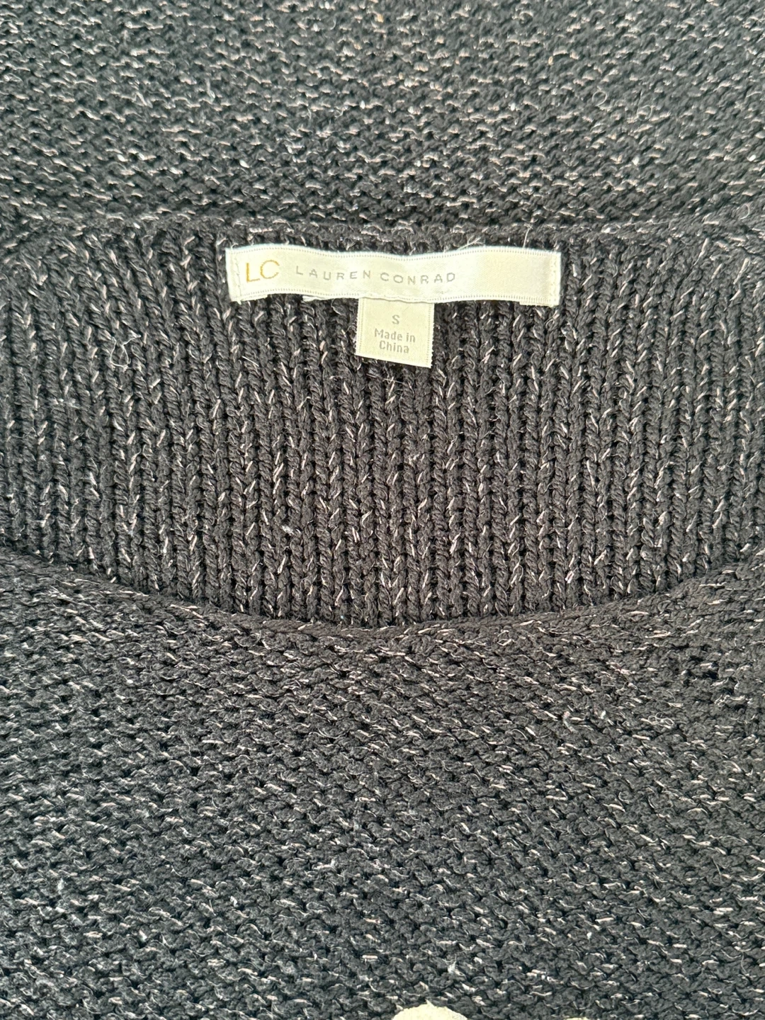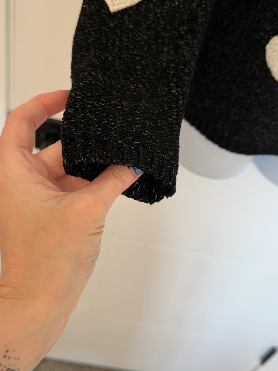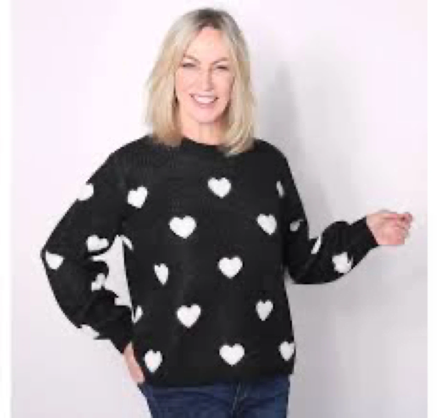 Crewneck black knit pullover with shimmering silver threads and featuring white soft hearts.