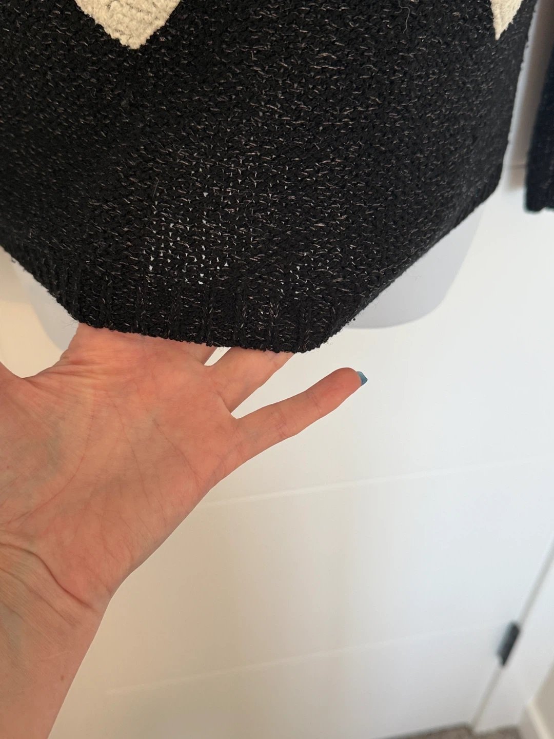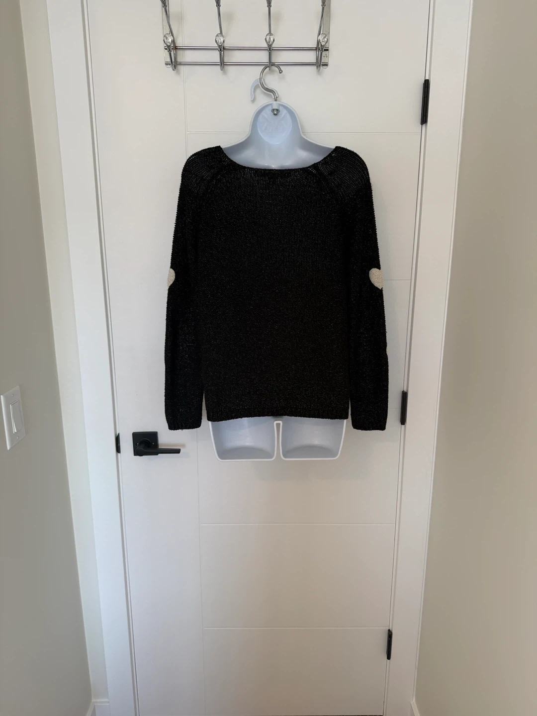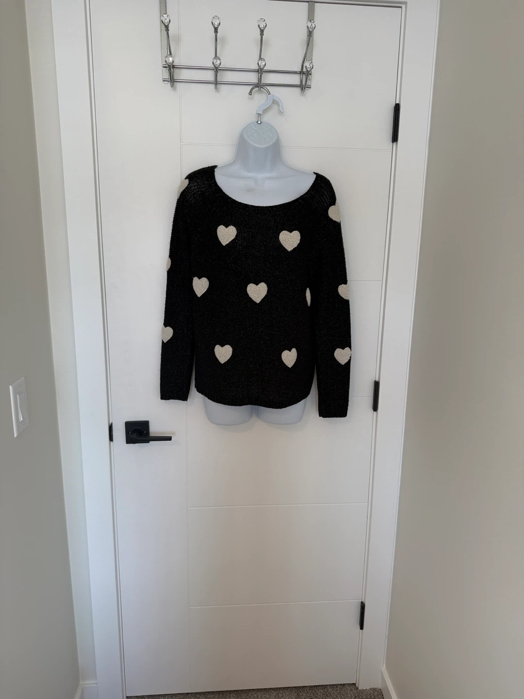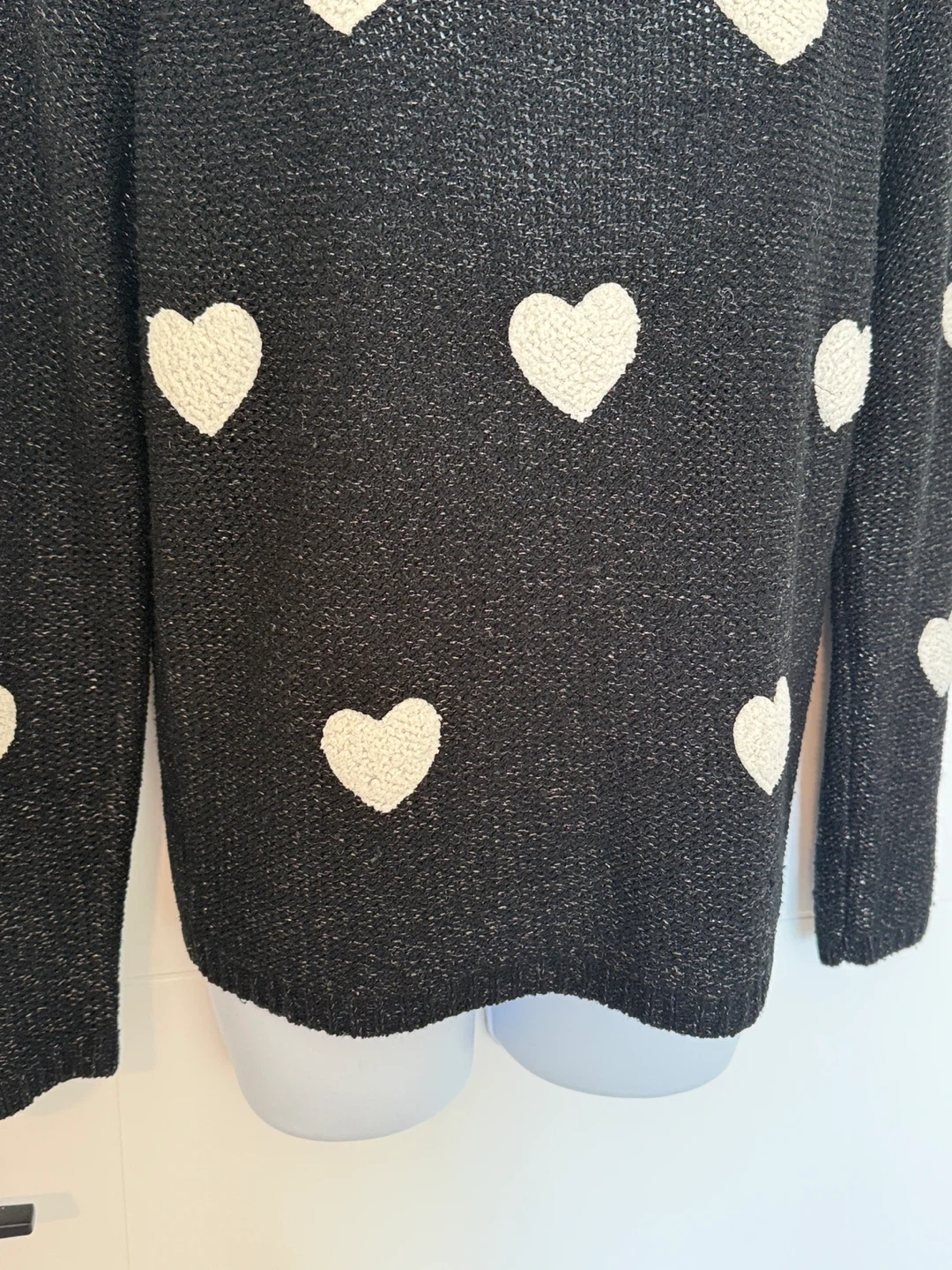 Crewneck black knit pullover with shimmering silver threads and featuring white soft hearts.