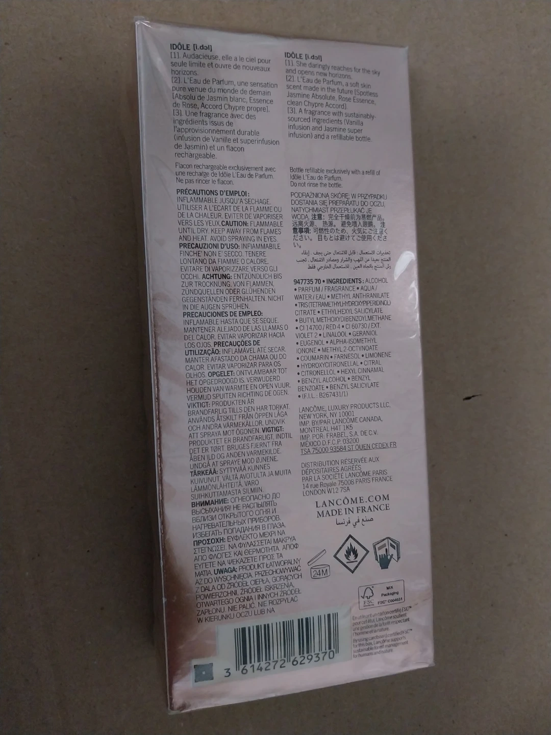 This is the Idôle L'Eau de Parfum by Lancôme. It's a refillable spray bottle containing 50 ml of fragrance. The scent is a delicate blend of rose, jasmine, and other sustainable floral notes.