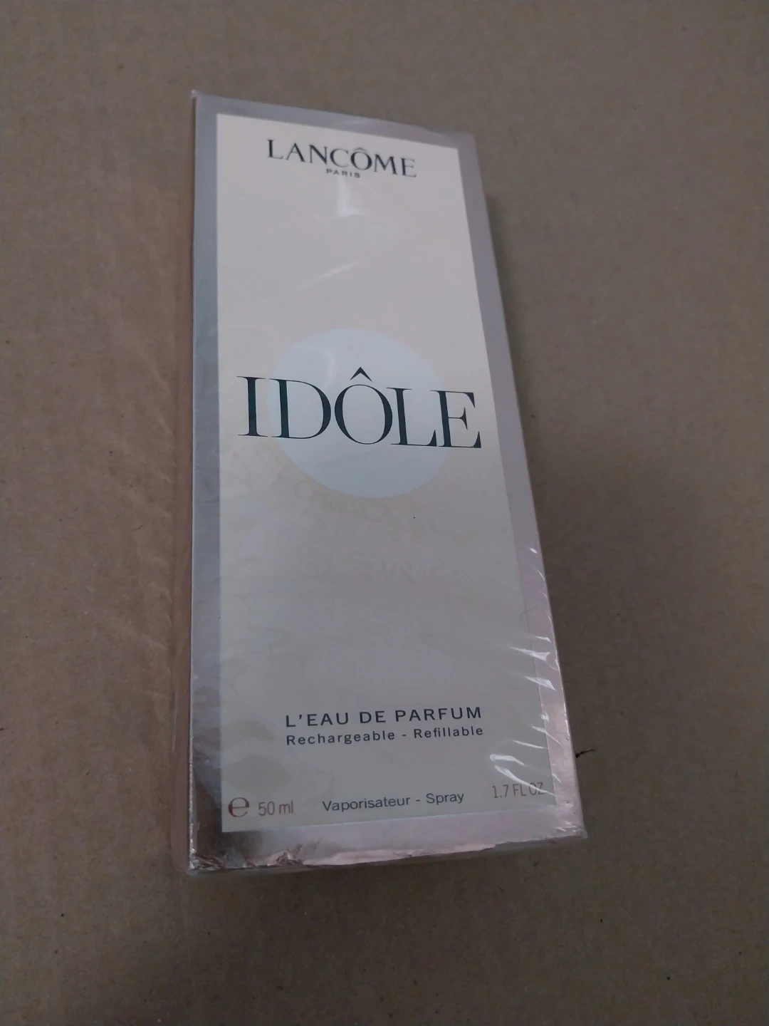 This is the Idôle L'Eau de Parfum by Lancôme. It's a refillable spray bottle containing 50 ml of fragrance. The scent is a delicate blend of rose, jasmine, and other sustainable floral notes.