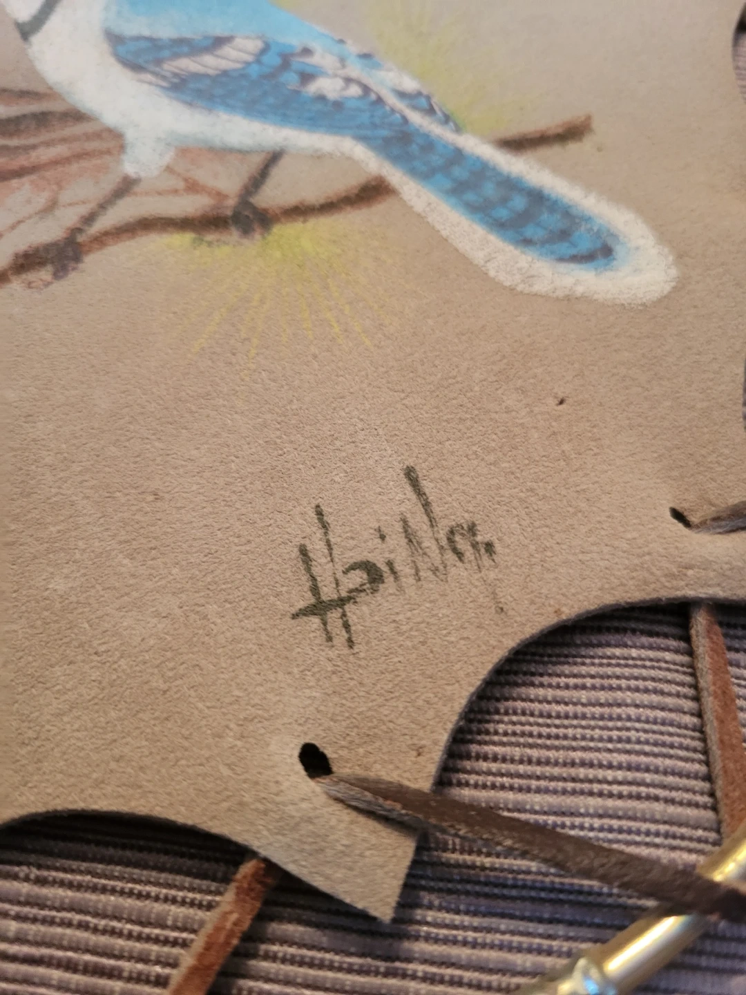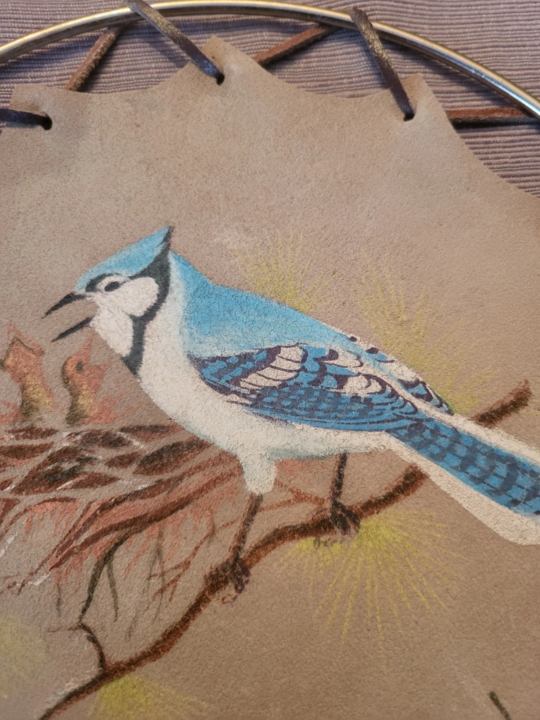 This decorative wall hanging features a hand-painted blue jay on a leather background, framed by a metal ring and leather lacing. It's a unique piece of art for your home. Measurements are approximately 9 inches in diameter.