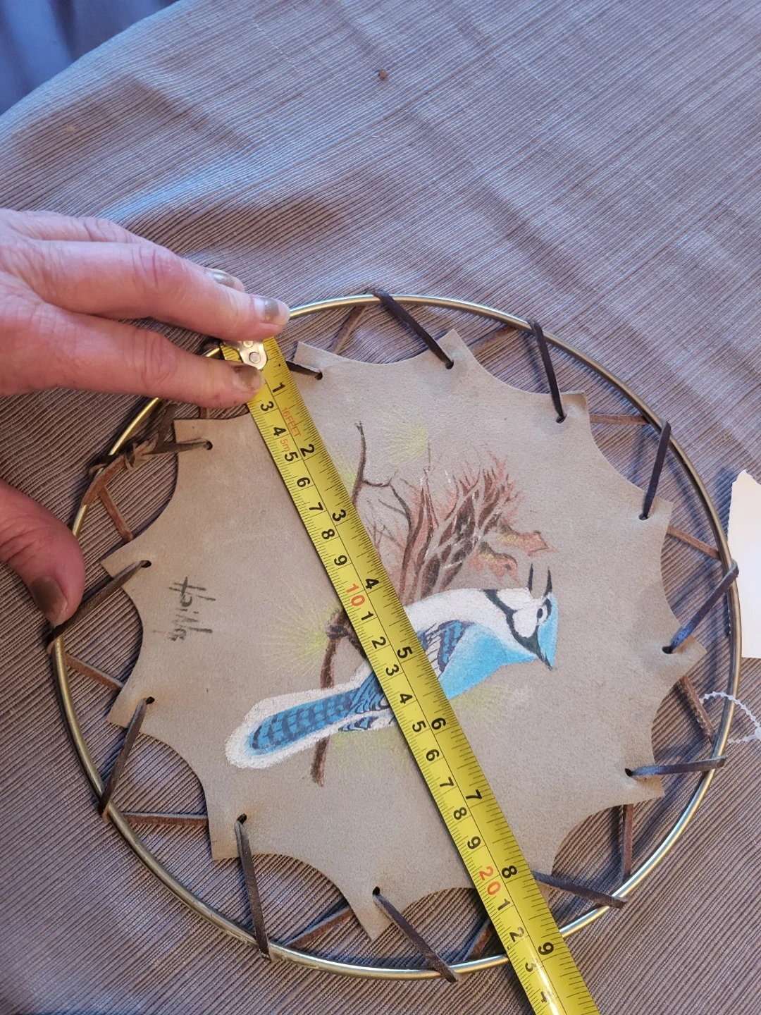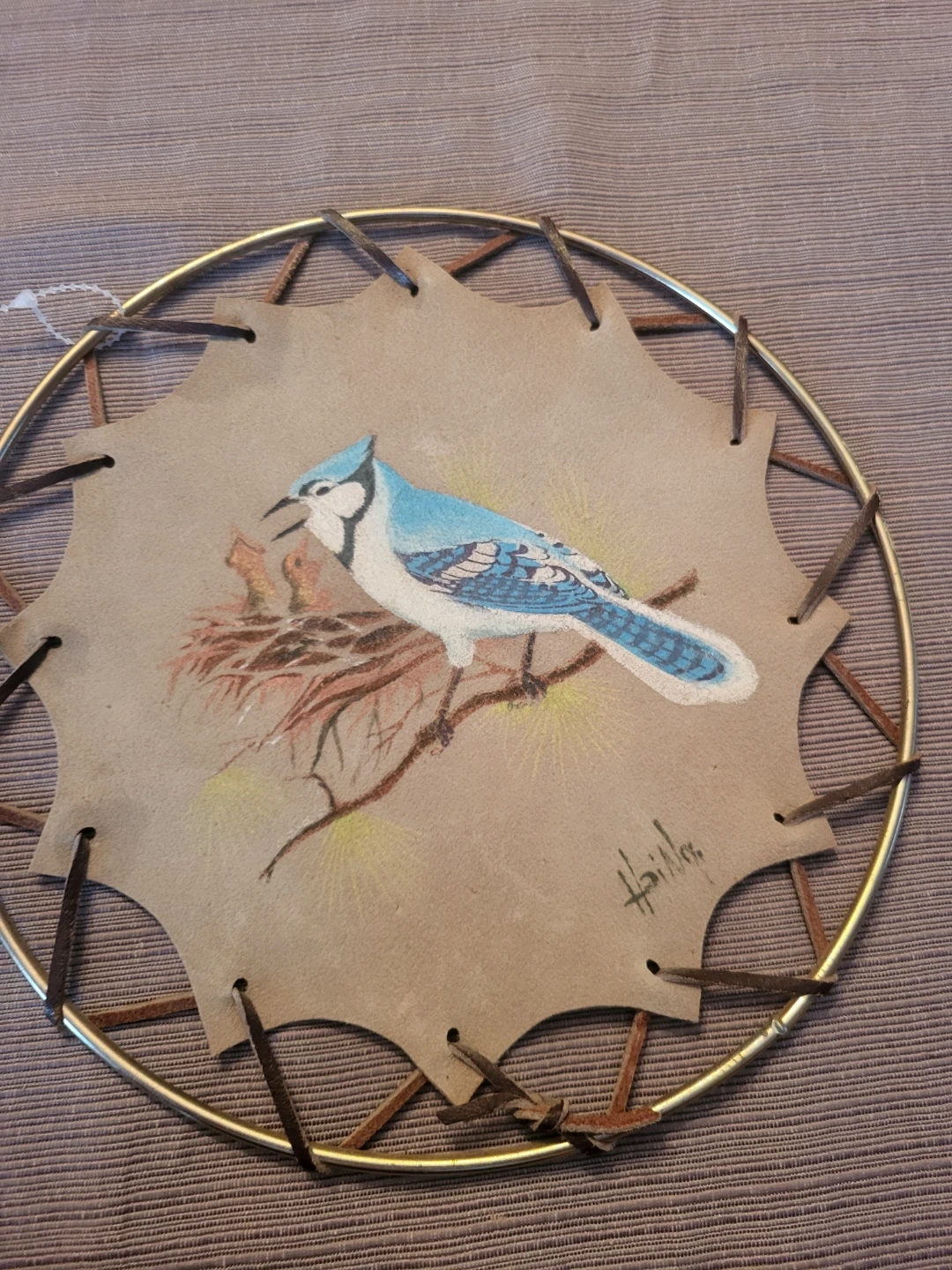 This decorative wall hanging features a hand-painted blue jay on a leather background, framed by a metal ring and leather lacing. It's a unique piece of art for your home. Measurements are approximately 9 inches in diameter.