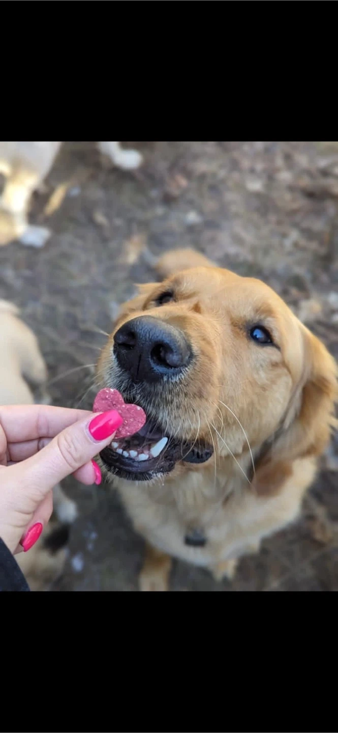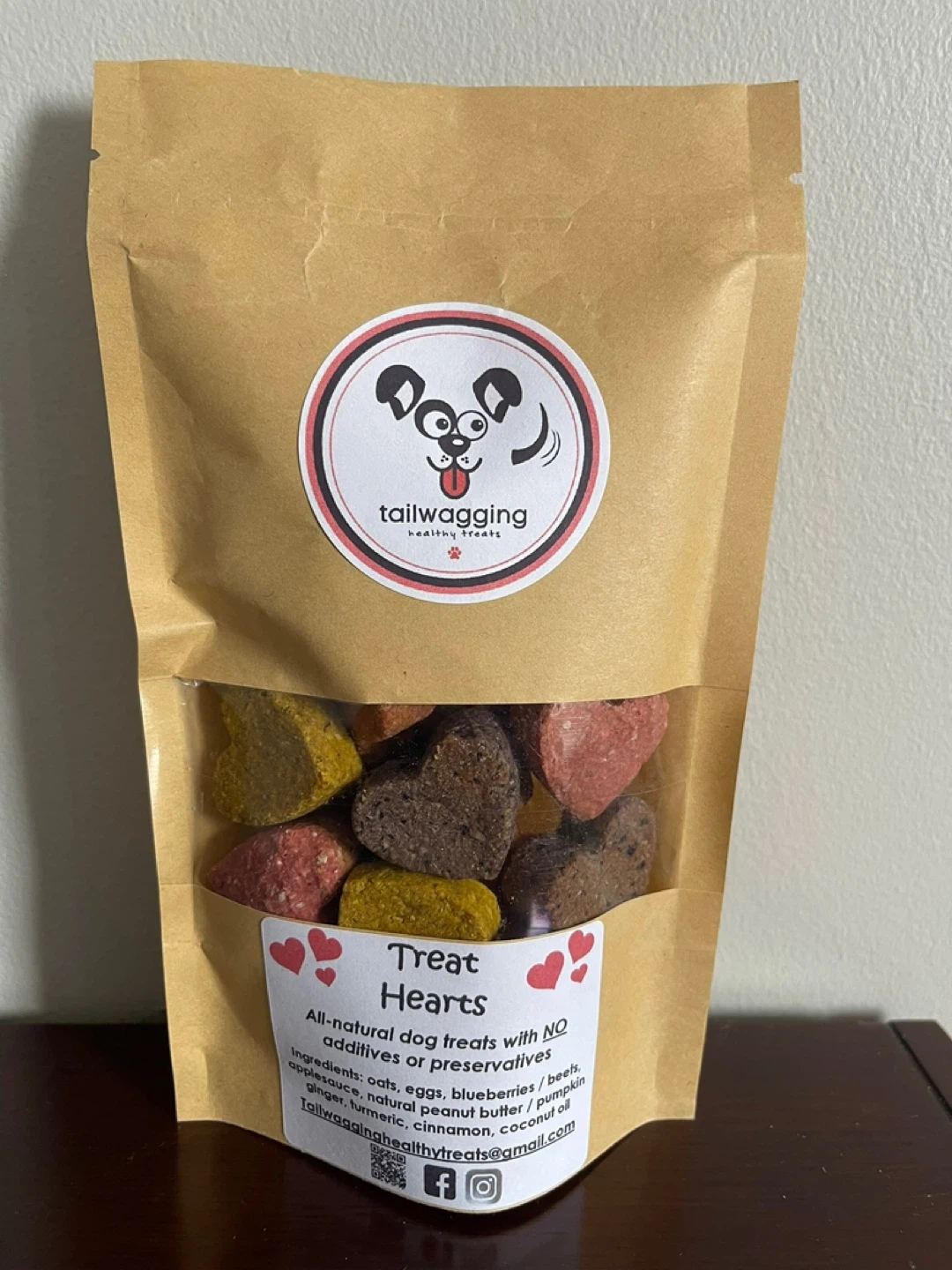 All-natural dog treats made with oats, eggs, blueberries, beets, apple sauce, natural peanut butter, pumpkin, ginger, turmeric and coconut oil. These heart-shaped treats contain no additives or preservatives. They're great for rewarding your furry friend!