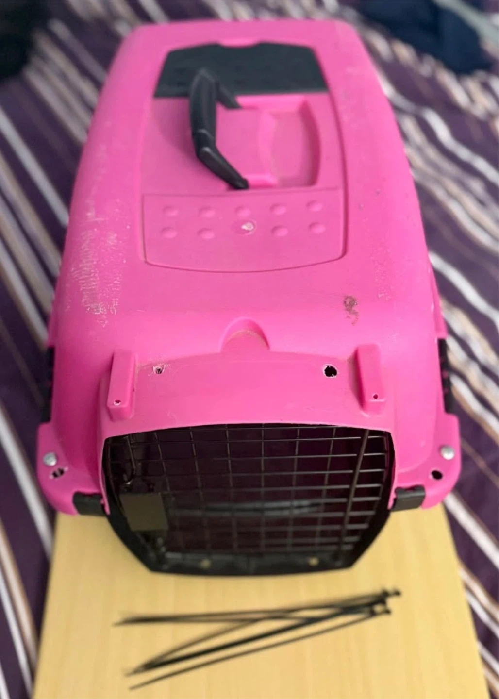 This is a pre-owned pink pet carrier with a black wire door. It features ventilation on the sides and a top handle for easy carrying. It's suitable for small to medium-sized pets. Airplane approved. Come with 6 zip ties to complete package