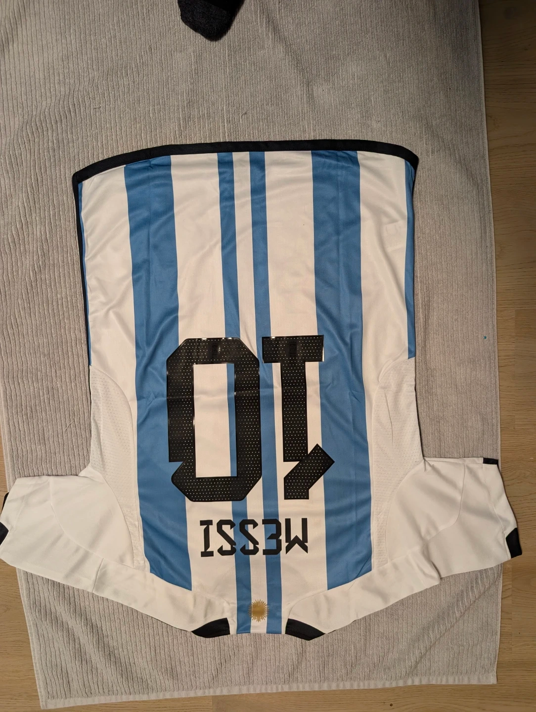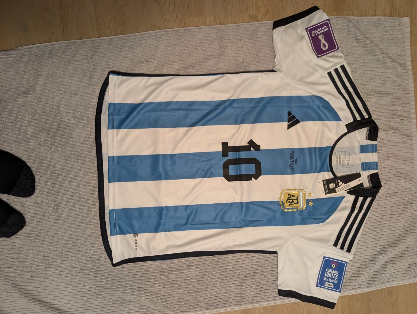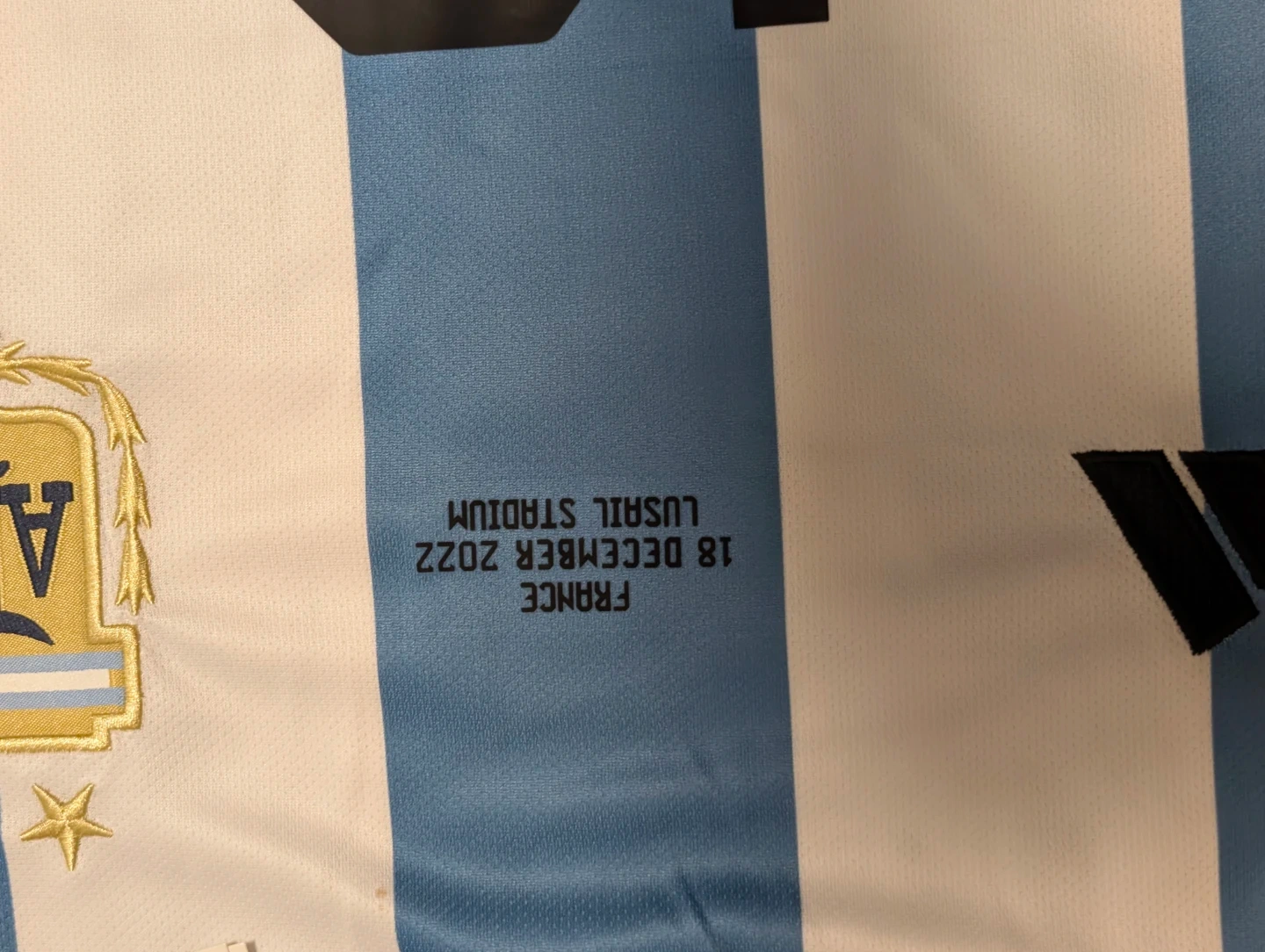 Argentina jersey with Messi 10 on the back. Features "FRANCE 18 DECEMBER 2022 LUSAIL STADIUM" printed inside. This commemorates the World Cup final match. It's made from lightweight, breathable fabric.