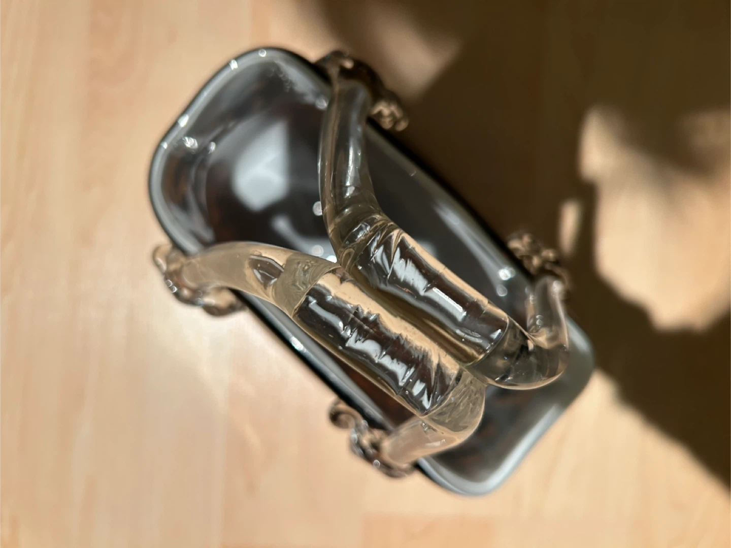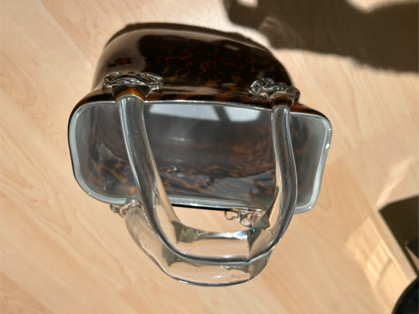 A unique glass vase designed like a handbag with a tortoiseshell pattern. It features clear glass handles. This decorative piece is great as a standalone accent item.