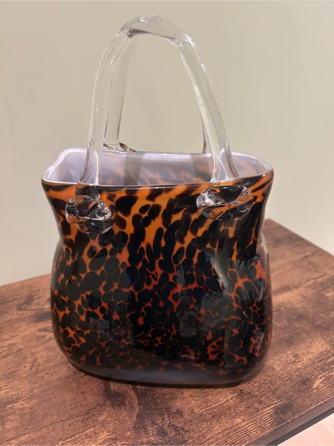 A unique glass vase designed like a handbag with a tortoiseshell pattern. It features clear glass handles. This decorative piece is great as a standalone accent item.