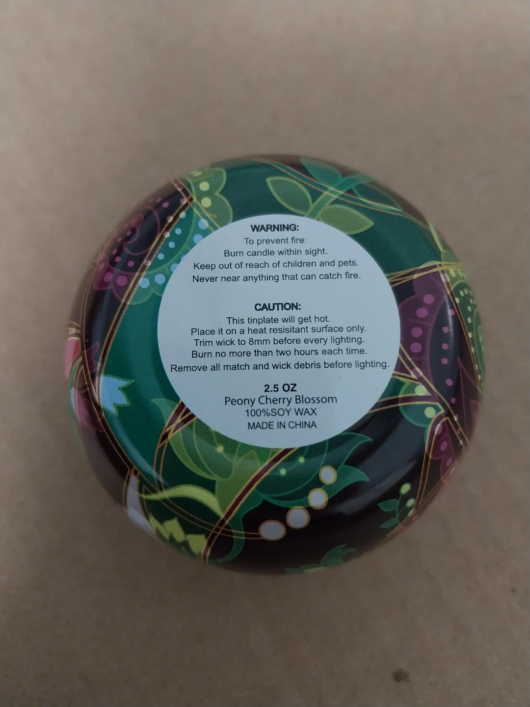 This tinplate candle is made with 100% soy wax. It features a Peony Cherry Blossom scent. Burn time is no more than two hours each time.