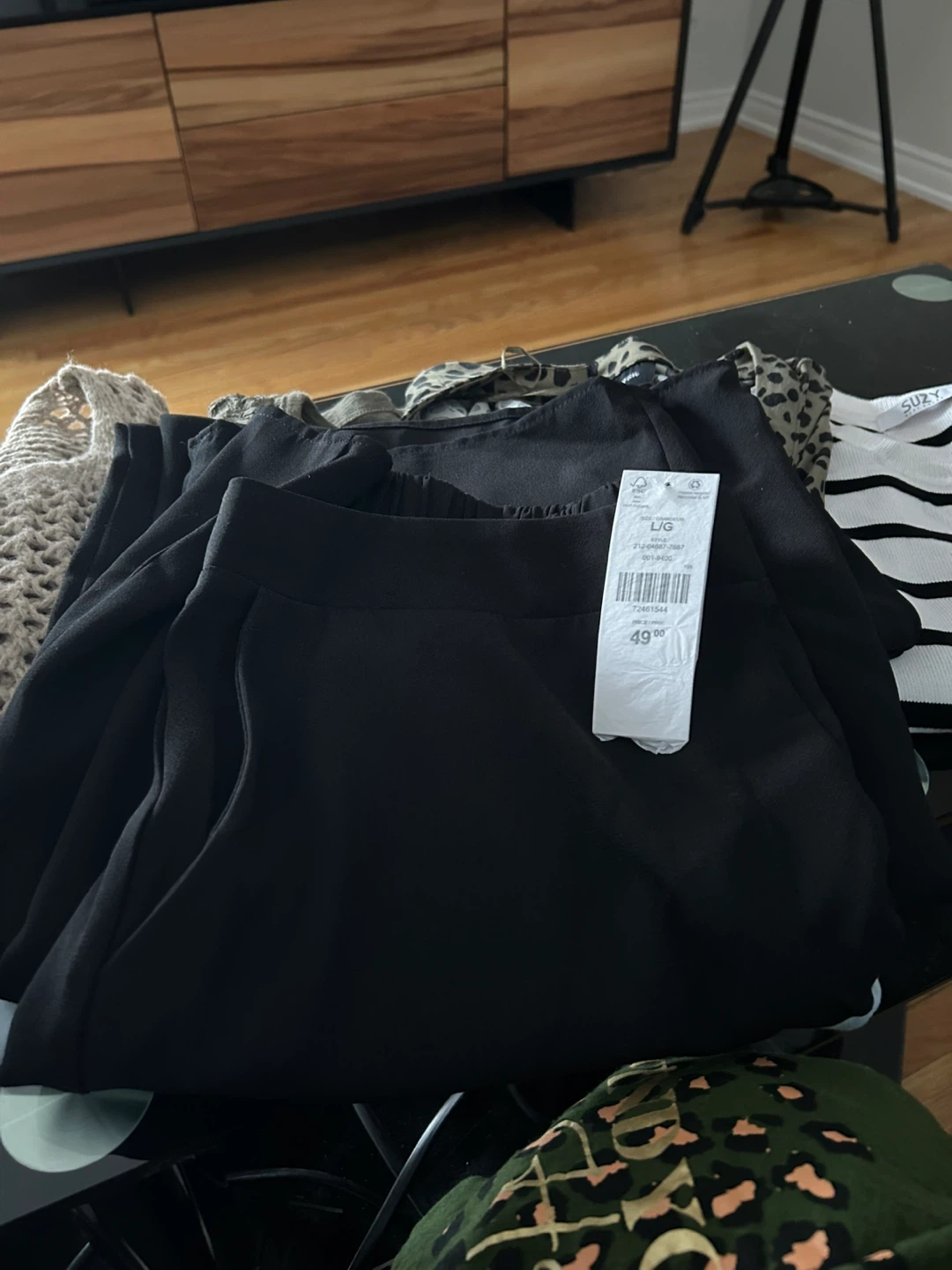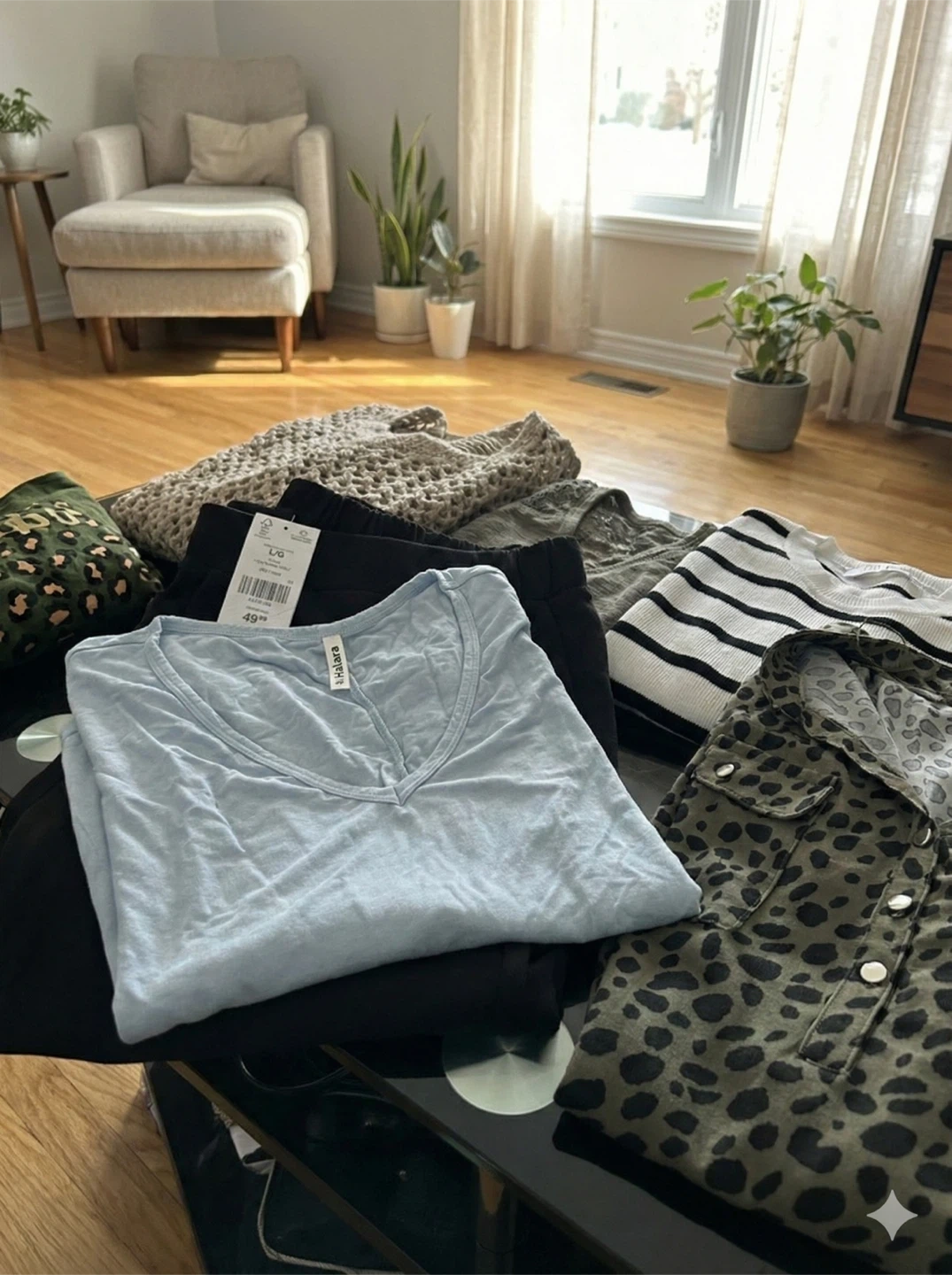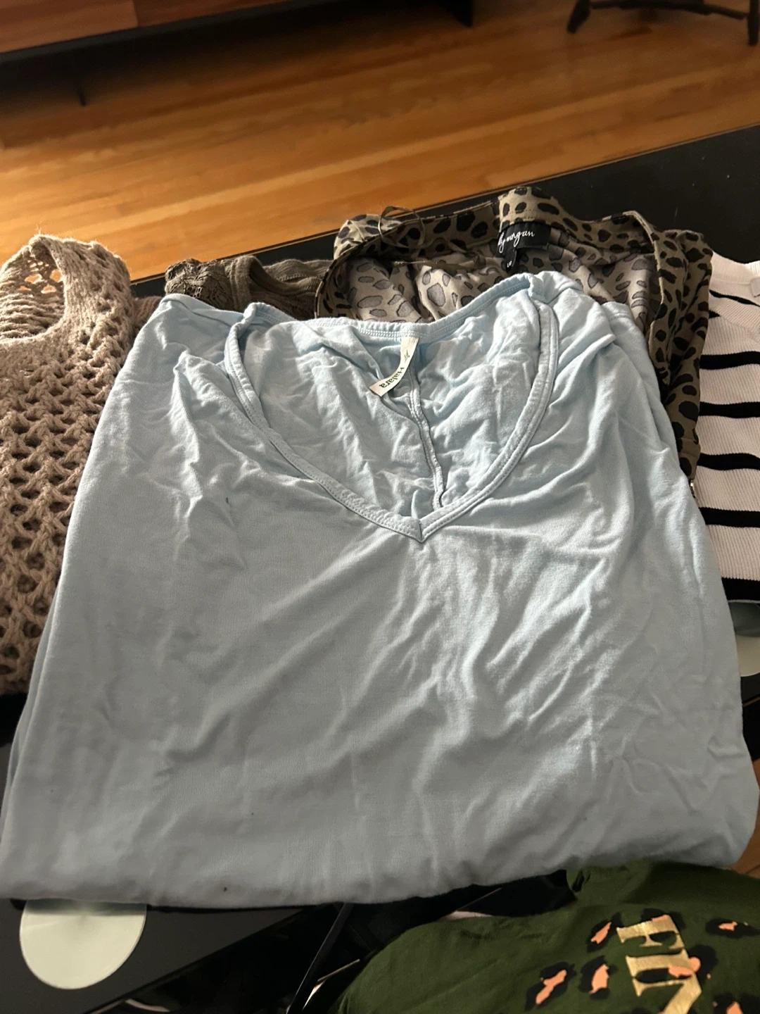 This bundle includes various women's clothing items. Features a light blue V-neck t-shirt and a black pair of pants tagged at LG. Also includes a leopard print button-up shirt and a striped knit top.