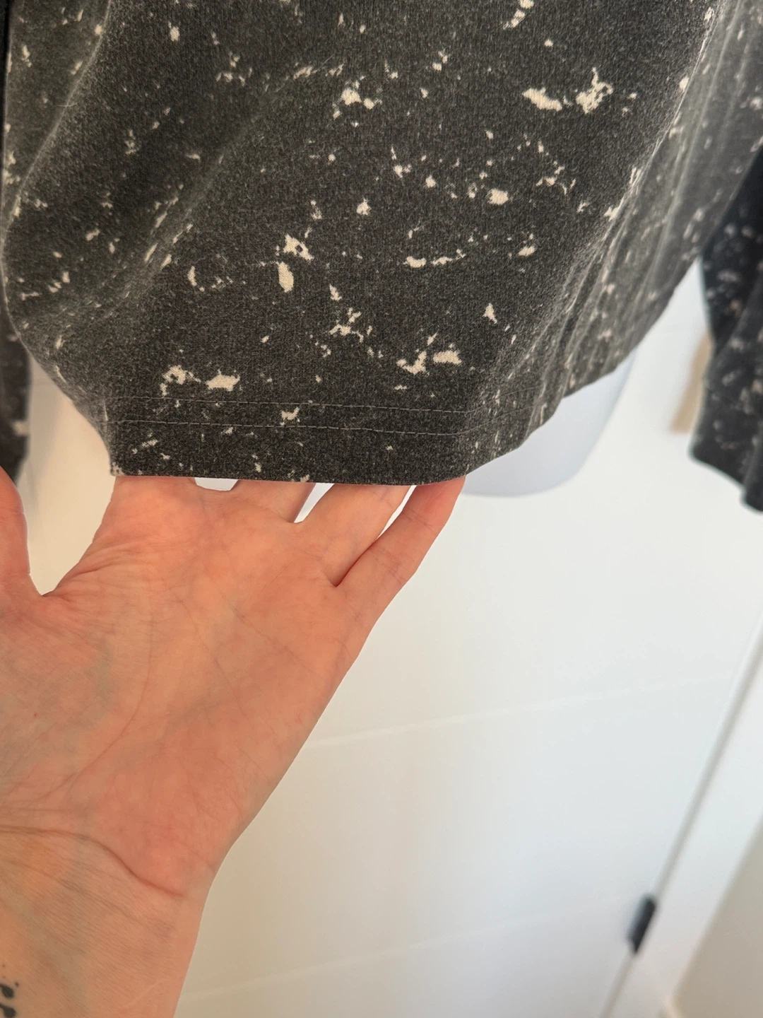 crew neck sweatshirt with long sleeves. Black and white marble with light purple “Barbie” print on the front.
