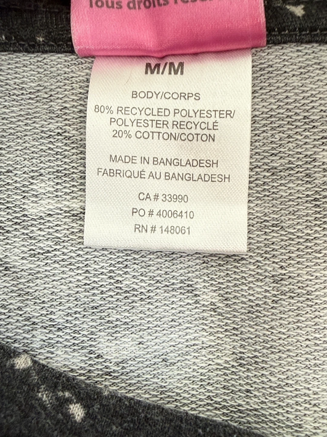 80% recycled polyester, 20% French Terry cotton.