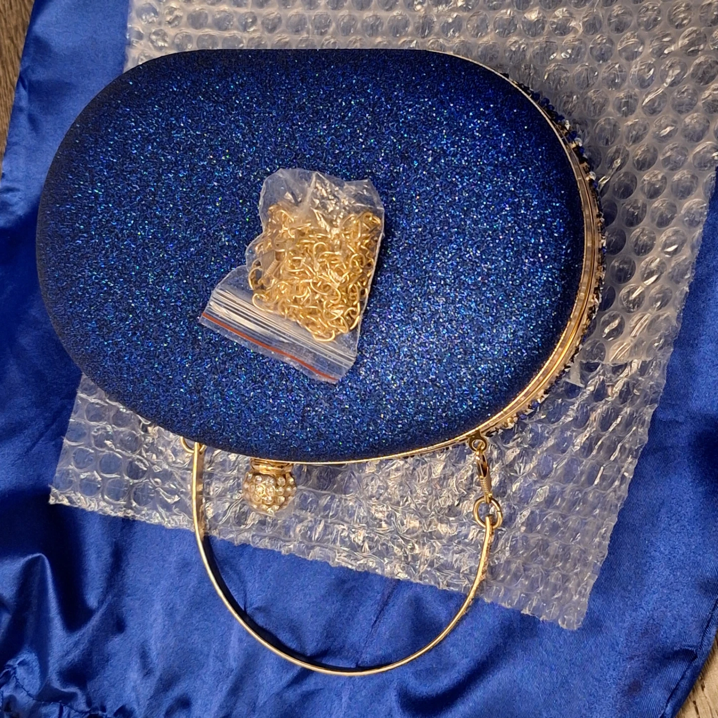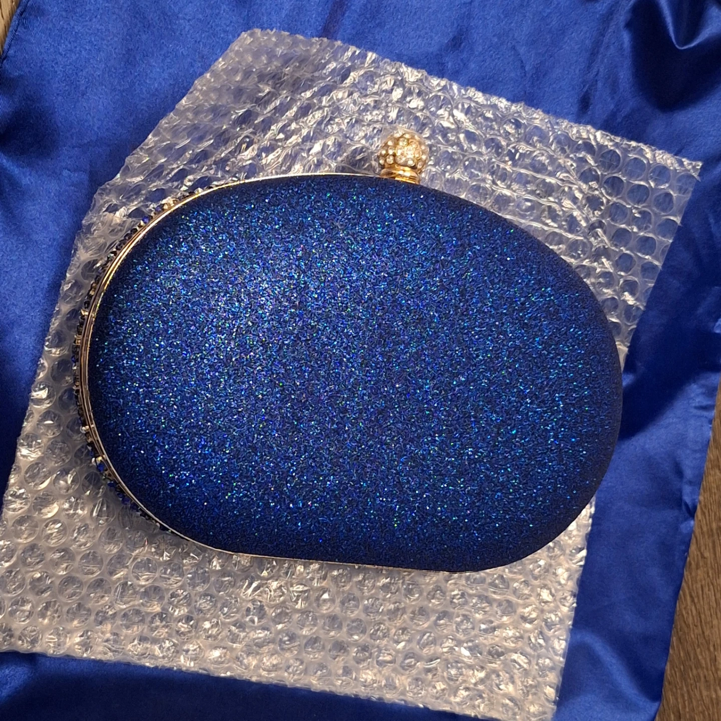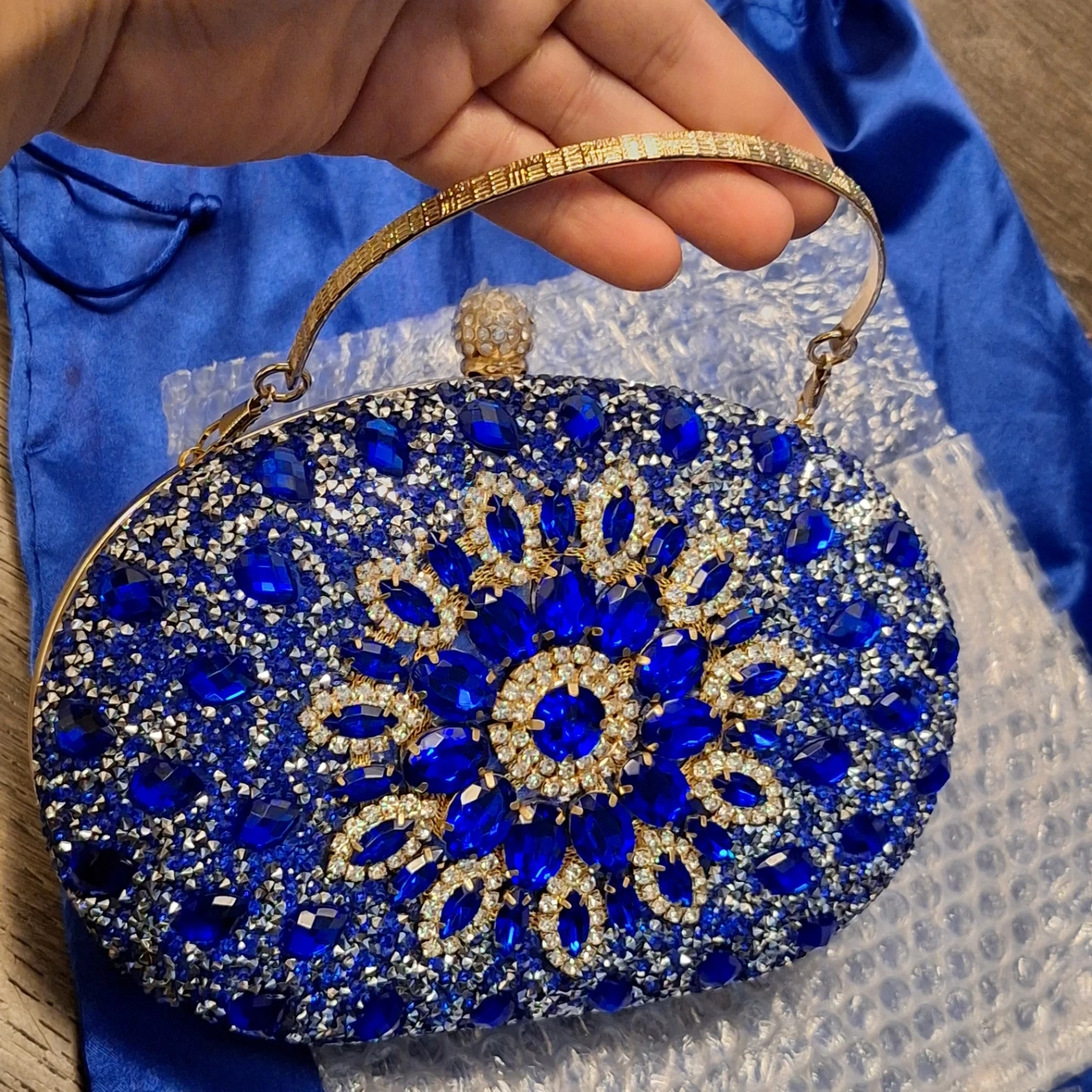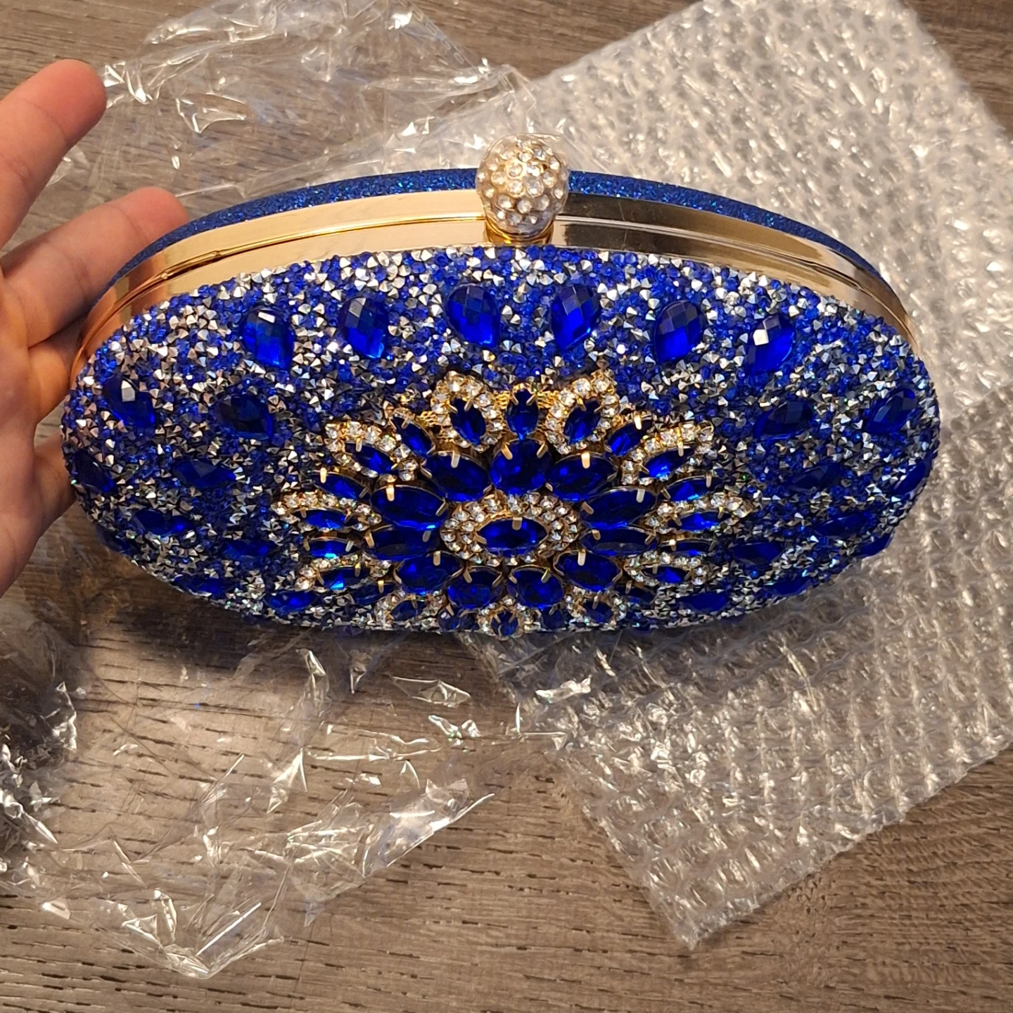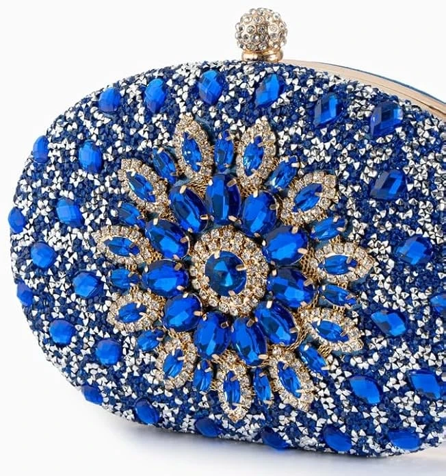 This stunning blue clutch is covered in dazzling rhinestones and beads with a floral design. It has a secure clasp and a detachable gold chain strap for versatility. Includes a protective dust bag VERANO HILL