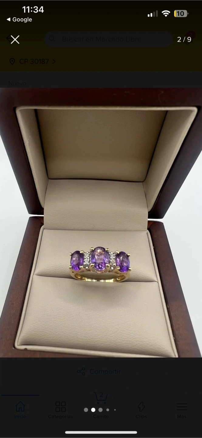 It has three central gems of purple tone, which due to their color and appearance could correspond to amethysts π, finely set and surrounded by diamonds with color classification F, which provide a subtle and refined shine.