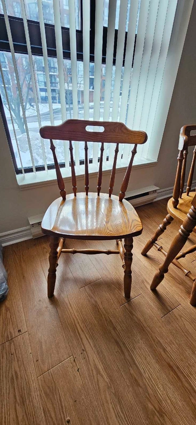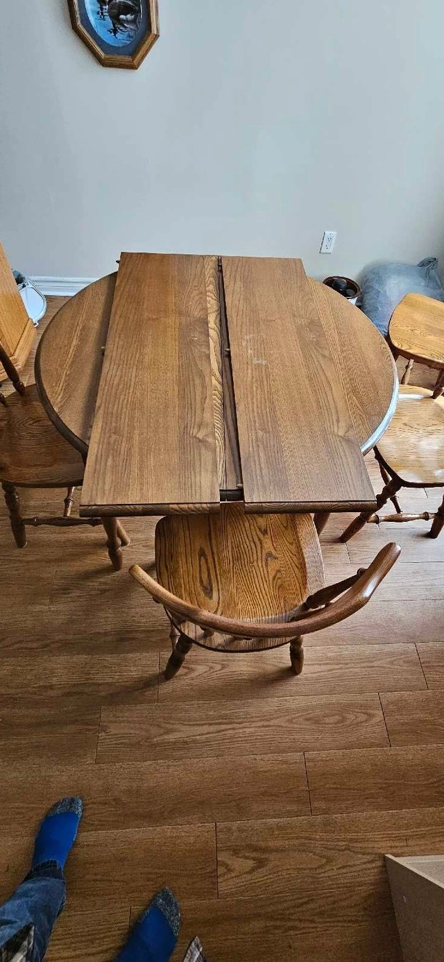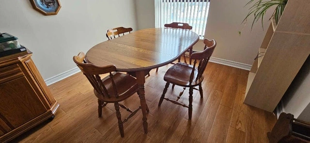 This is a used, solid wood kitchen table with four chairs, perfect for a small to medium-sized dining area. The table has two extendable leaves, allowing you to easily accommodate extra guests for family dinners or social gatherings. While it has some wear and tear, it's structurally sound and ready for a new home. Table dimensions: Oval 40" x 62" with 2 leaves (each 11"). Material: Solid wood. Includes: Table and four matching chairs. Condition: Used, with some surface scratches and wear. Cash accepted.