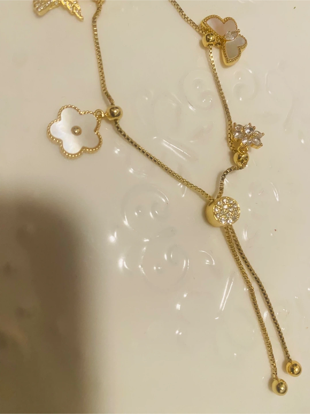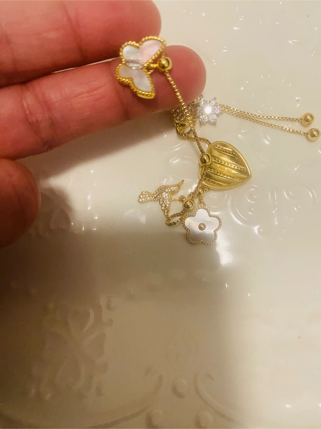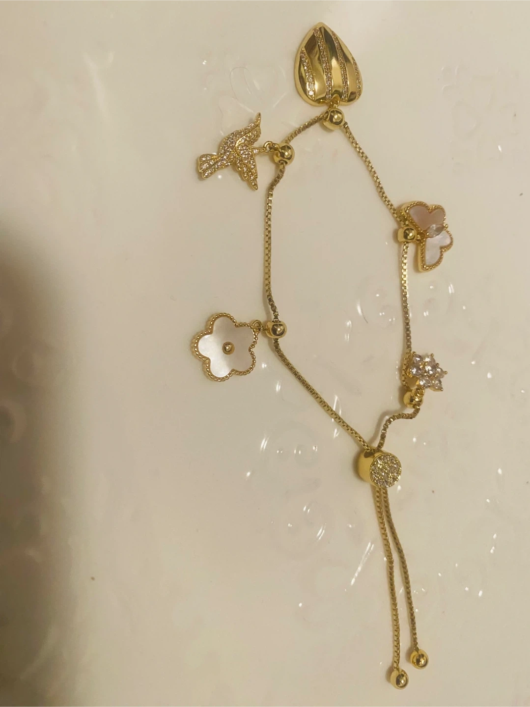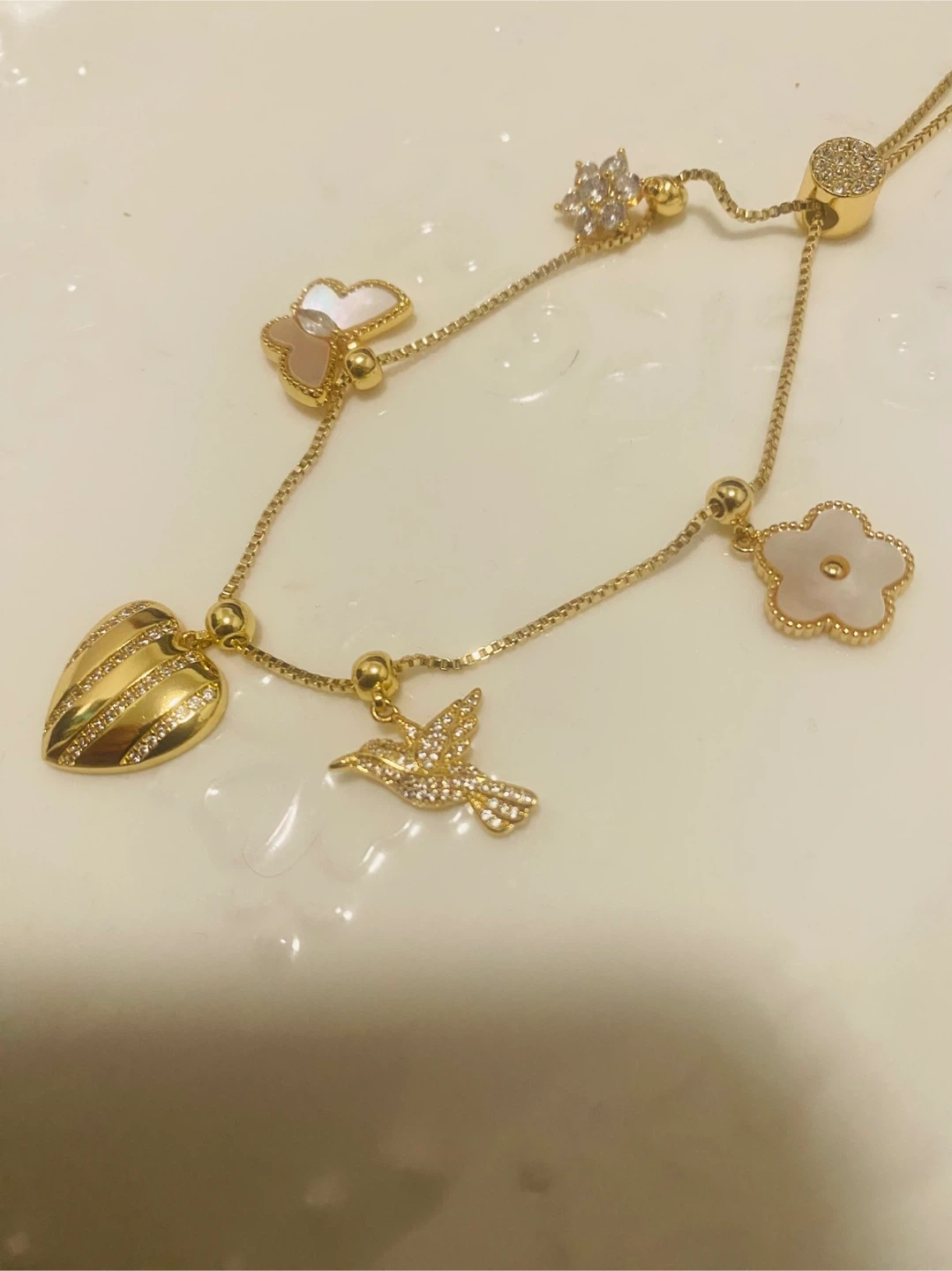 This gold-tone necklace features a delicate chain with multiple charms including a heart, a bird, and floral designs, some accented with rhinestones. It's adjustable for a comfortable fit. This piece adds a touch of sparkle to any outfit!