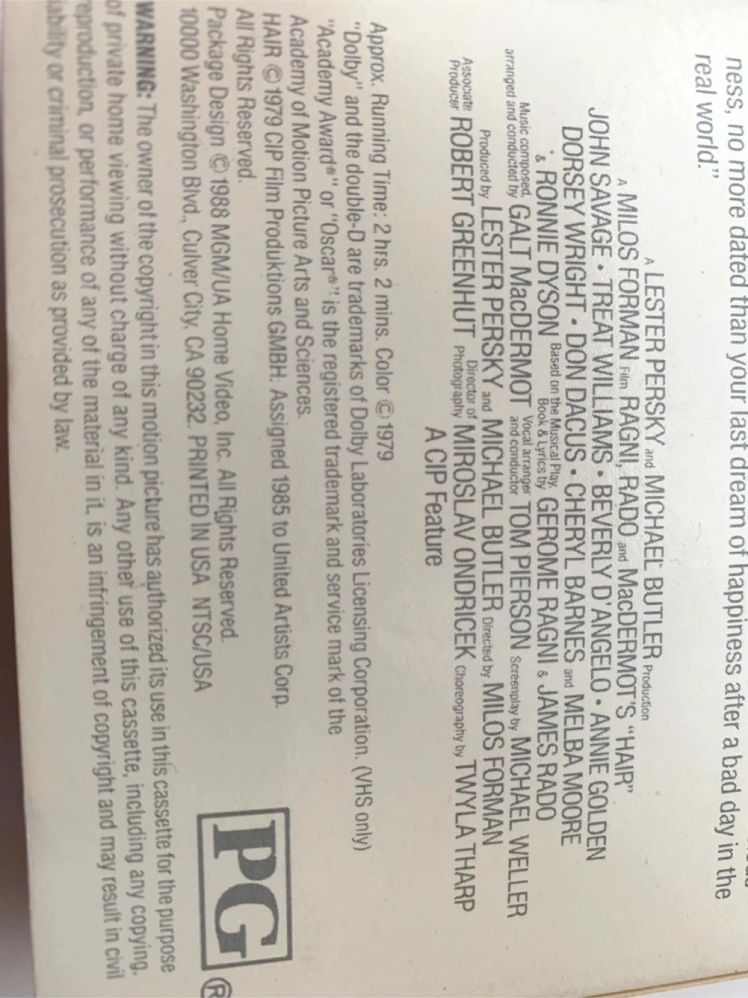 This is the VHS release of the movie "HAIR". It's a 1979 film directed by Miloš Forman. Running time is 2 hours and 2 minutes.