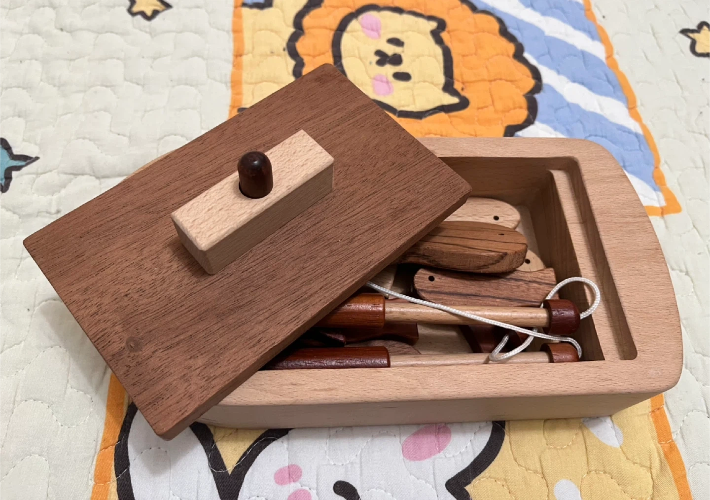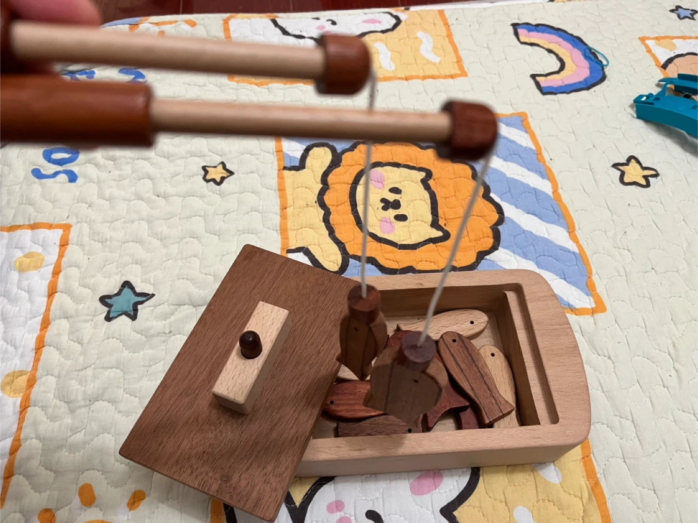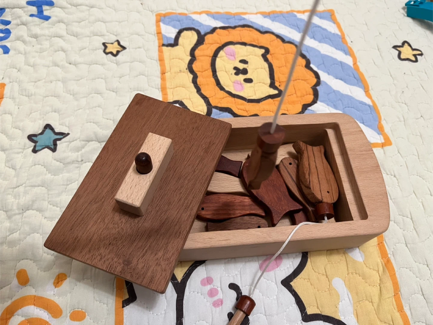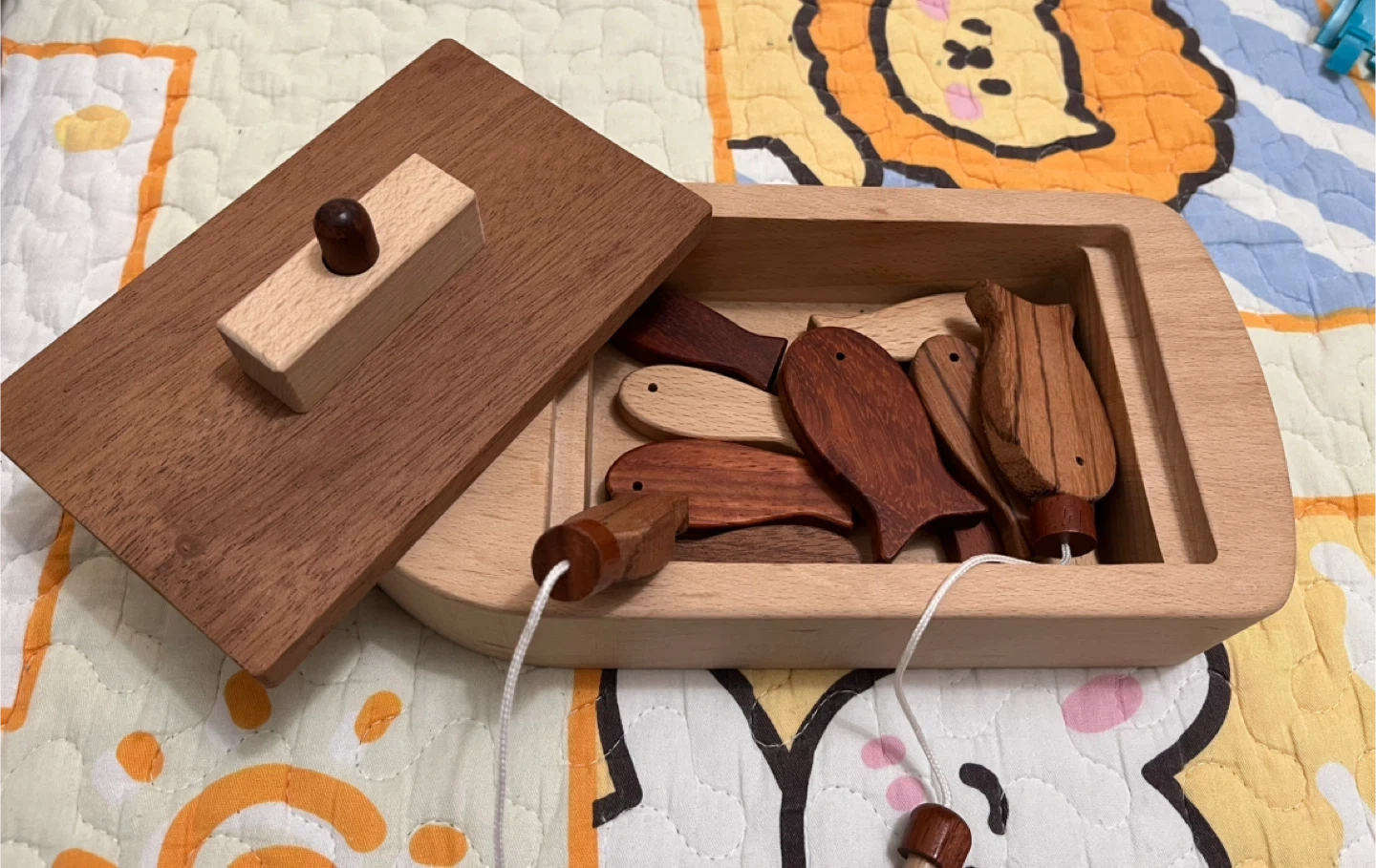 This wooden fishing game features a box with a lid and multiple wooden fish pieces. It includes a fishing rod with a string and magnetic attachment. It's a fun toy for developing fine motor skills. Great for toddlers and young children!