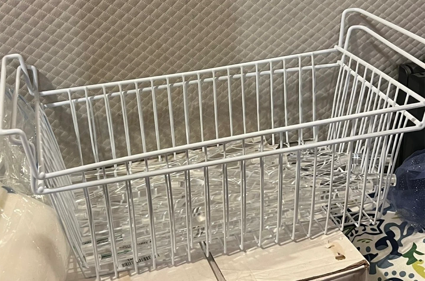 This is a white wire storage basket. It's made of metal wire. It's great for organizing items in your home or garage!