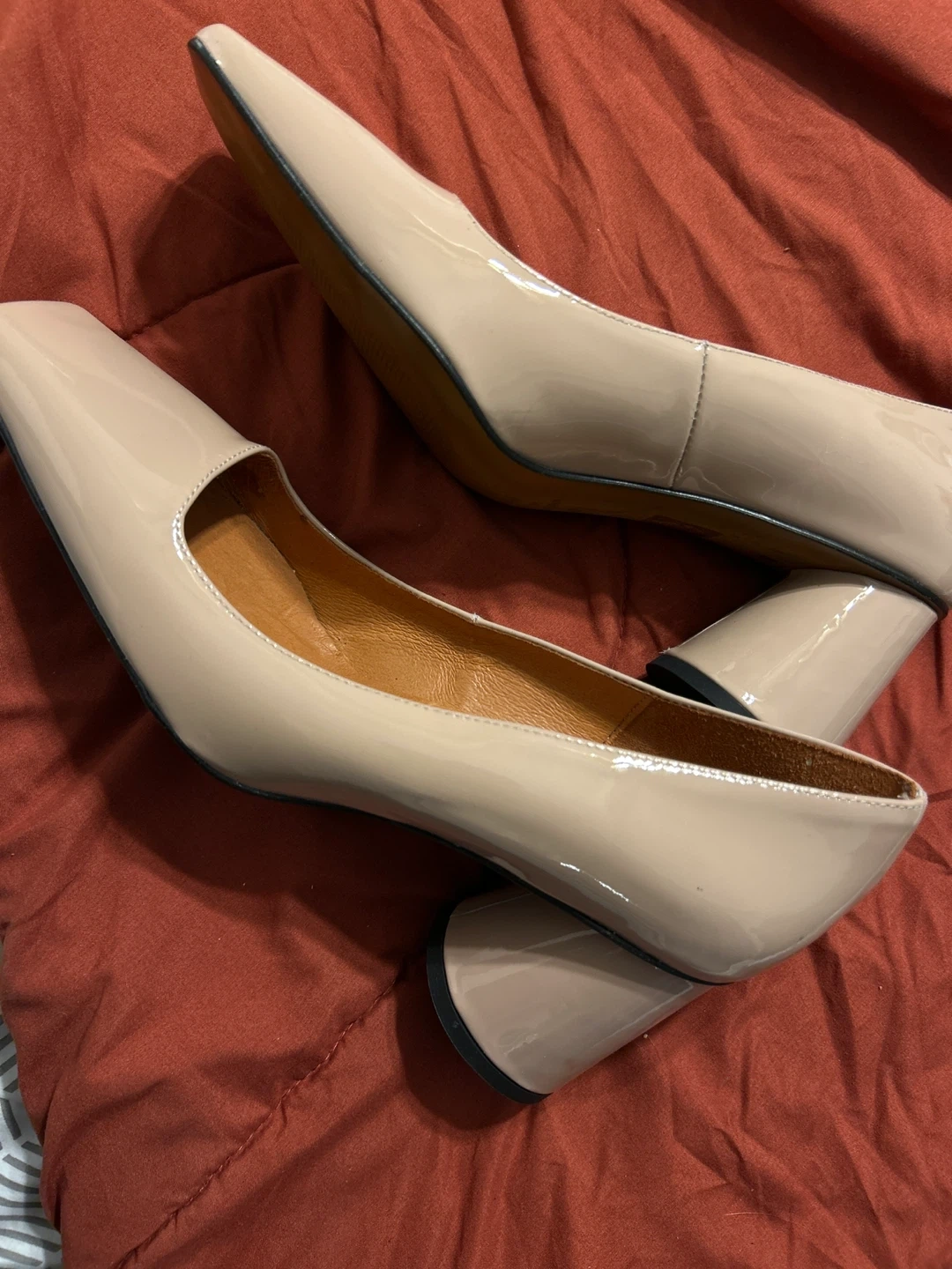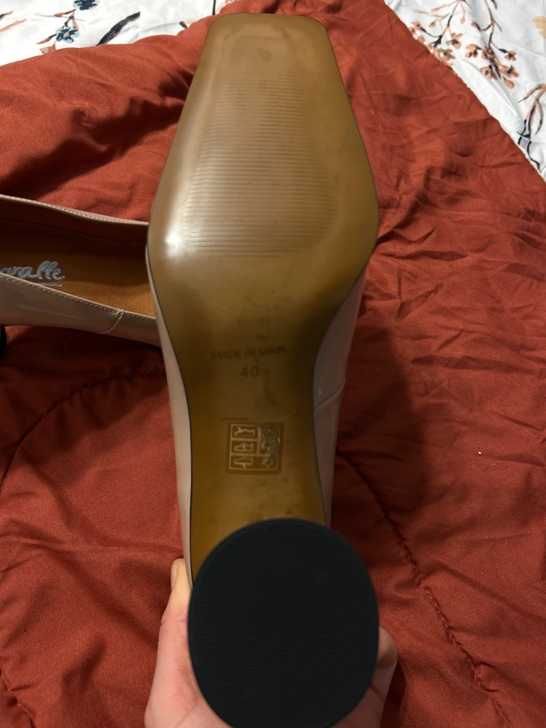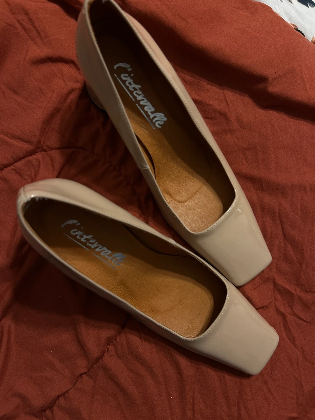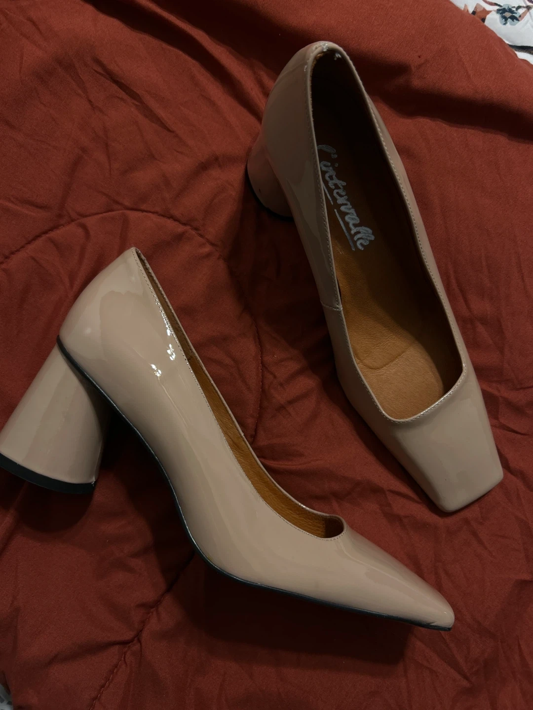 Victomalle women's block heel pumps in a patent beige finish. Made in Spain. Size 40.