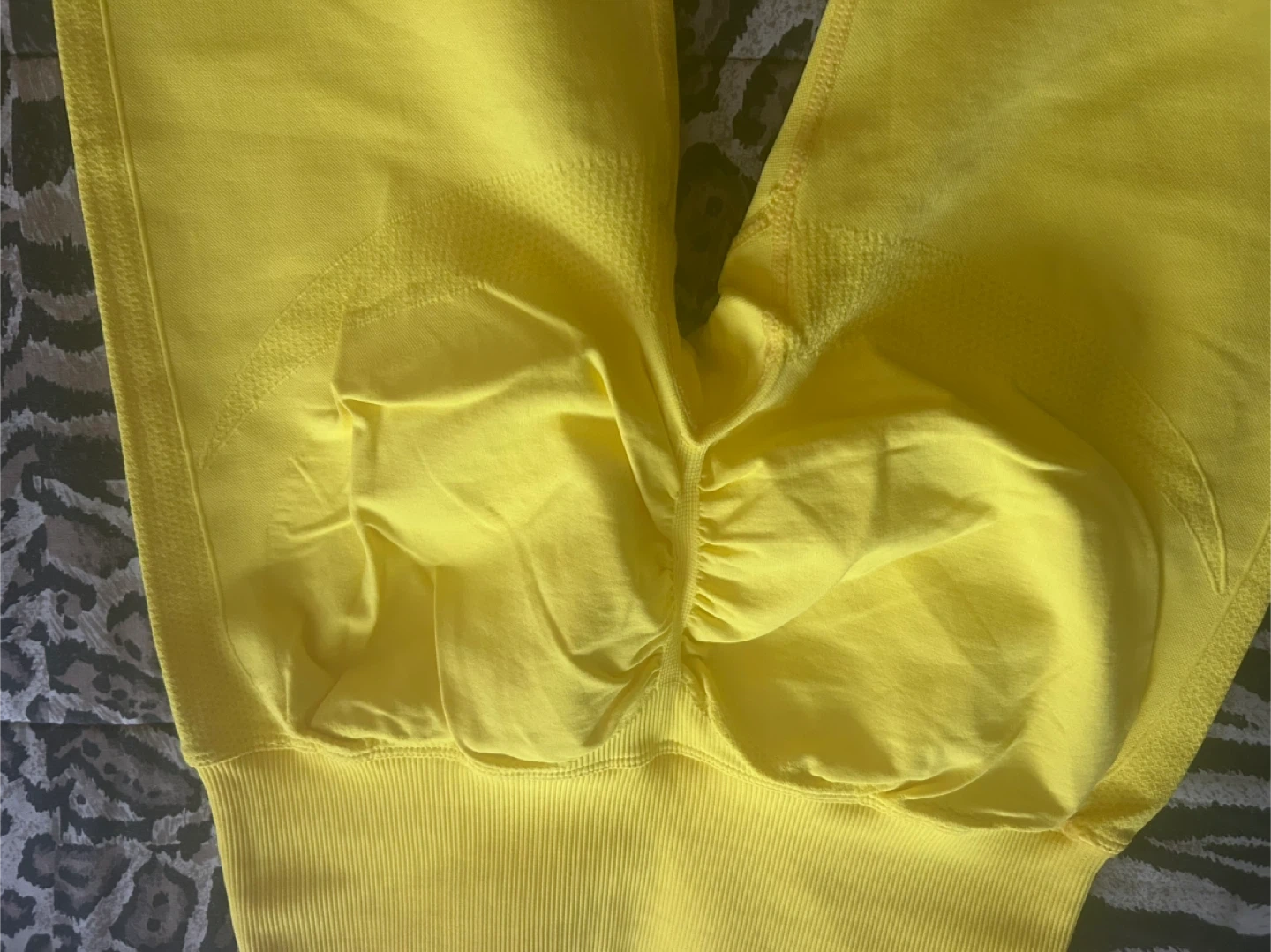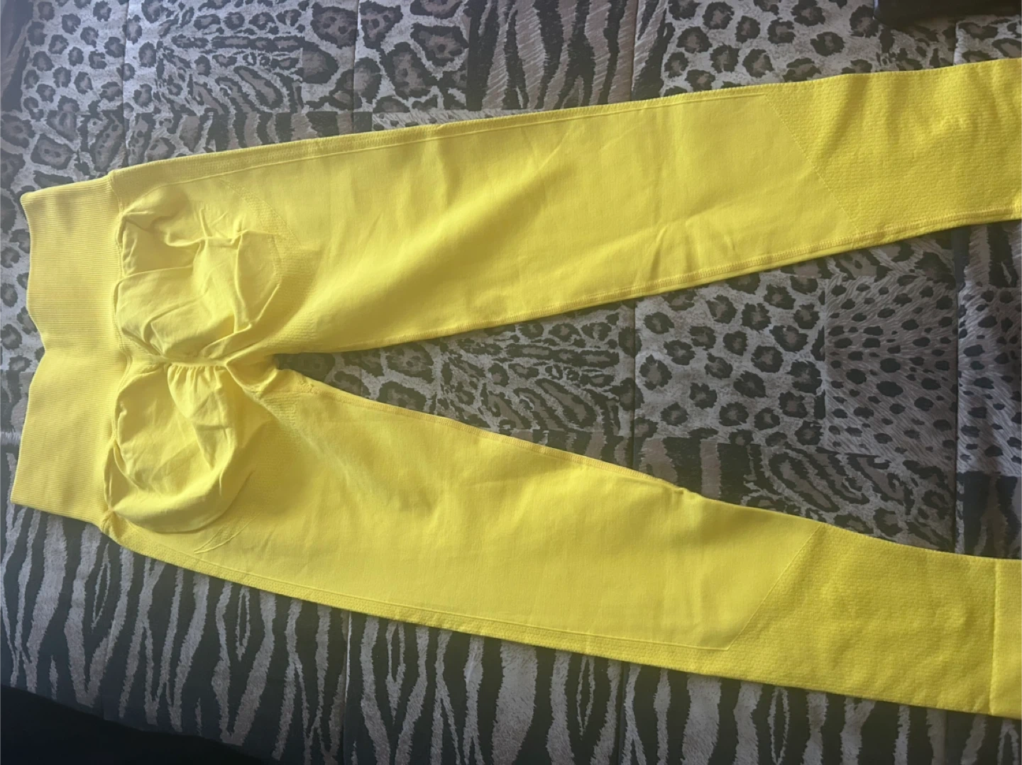 These bright yellow seamless leggings are designed for comfort and support. They feature a high-waisted fit with a textured waistband and bum-sculpting detail. Made from a stretchy, breathable fabric.