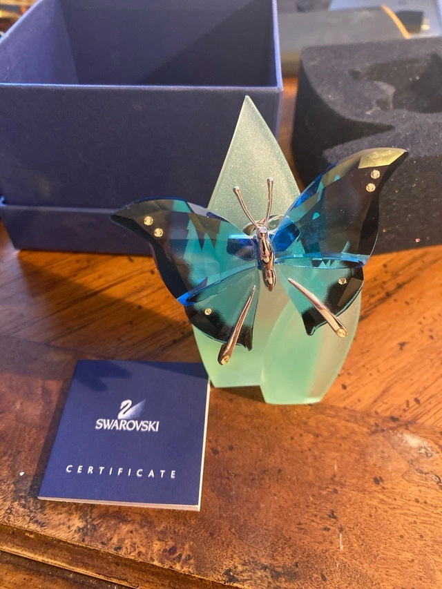 This is a Swarovski Crystal Paradise Ambur Butterfly in blue turquoise crystal. Designed by Roland Schuster, it was introduced in 2003 and retired in 2007 as part of the "Exotic Butterflies" collection. The piece has the code number 622735 and comes with a magnet and a stand. This lovely blue crystal butterfly figurine is perched on a frosted leaf stand and is in excellent, like-new condition. It beautifully captures the light and adds a touch of elegance to any space. Cashless payment and cash are accepted.
