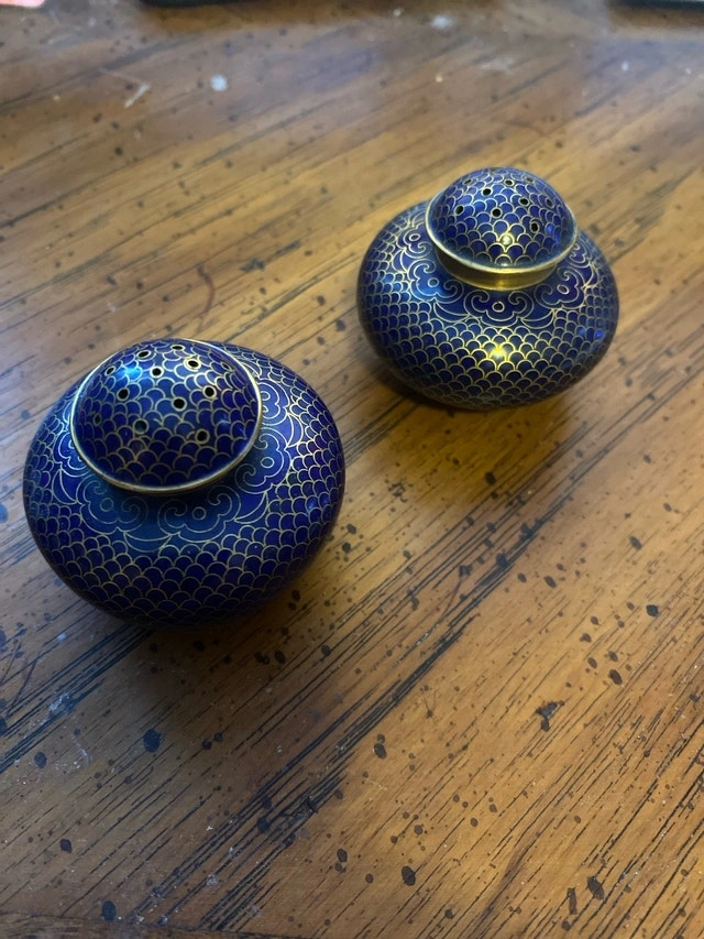 These are vintage Chinese cloisonné salt and pepper shakers, featuring a beautiful blue and gold design. They are in good condition, ready to add a touch of elegance to your dining table. These shakers are not new, but their intricate design speaks to their vintage charm. Material: Cloisonné. Design: Intricate floral patterns. Colour: Blue and Gold. Condition: Used, good condition.