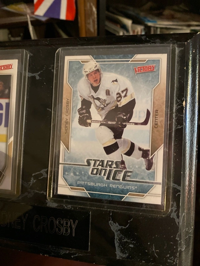 Own a piece of hockey history with these Sidney Crosby collectible cards! This display features two unique Sidney Crosby cards from his early career with the Pittsburgh Penguins. The cards are in great condition. They would make a fantastic addition to any hockey memorabilia collection. Ready to hang. This is a used item. Cash accepted.
