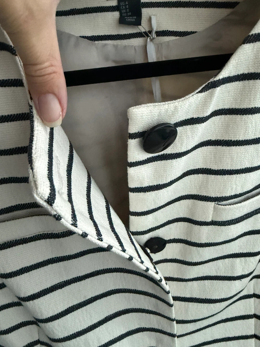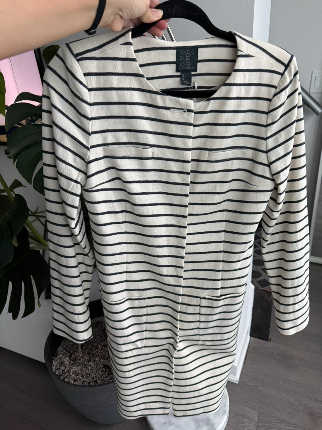 This is a long jacket with a classic black and white stripe pattern. It has a round neckline and button closure. The blazer is a size 4 US.