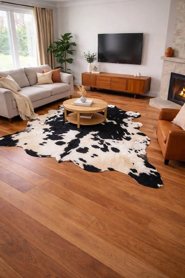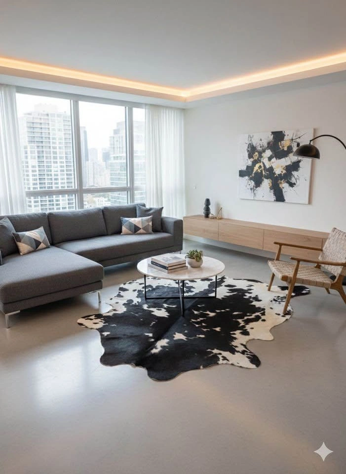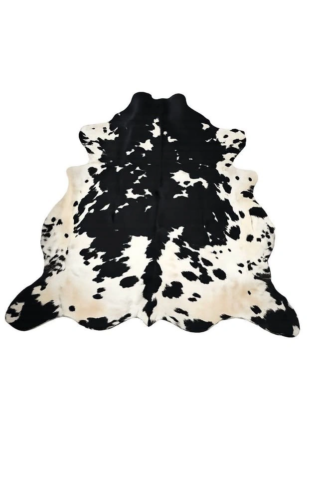 100% authentic Colombian cowhide rug, natural leather with a unique black & white pattern. Perfect for modern, boho, Scandinavian, or rustic spaces. Size: approx. 7.3 x 6.7 ft (222 x 205 cm). One of a kind.