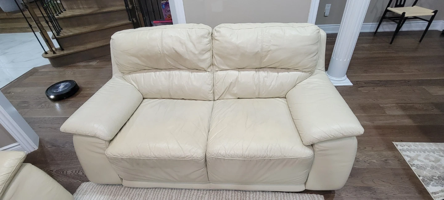 Comfortable cream leather loveseat. It's made of genuine leather and has plush cushioning. This loveseat offers a cozy spot for two people.