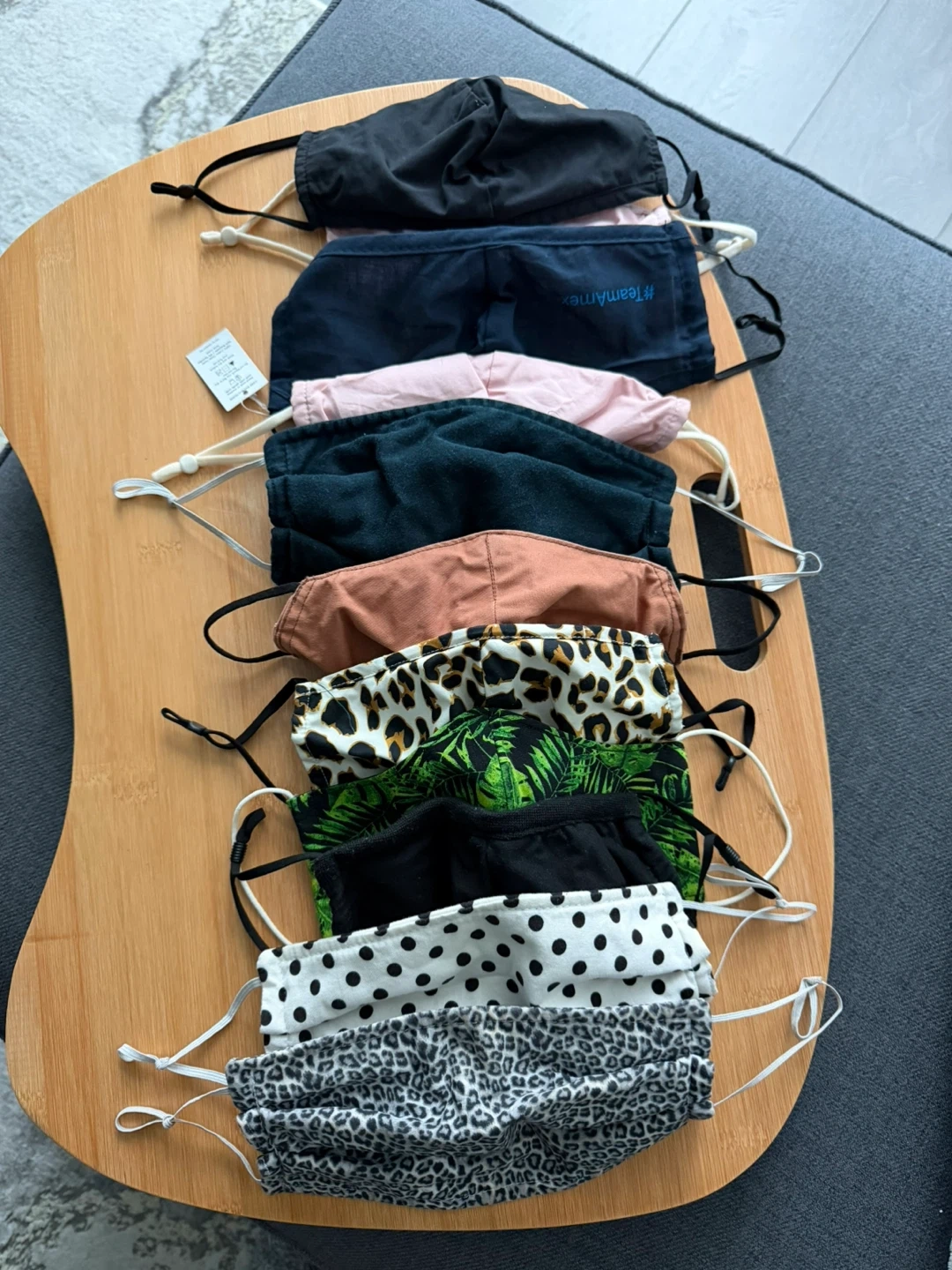 A collection of 10 reusable fabric face masks in various patterns and solid colours. They're made from breathable materials and come with adjustable ear straps. Includes leopard print, polka dots, tropical leaves, black, navy blue, pink, and burnt orange styles.