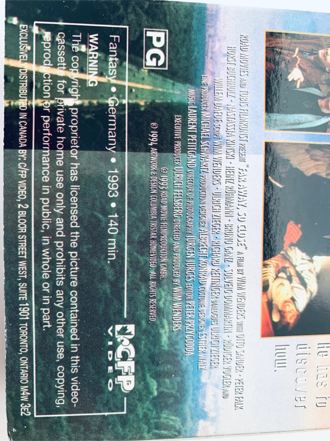 This is the VHS release of Wim Wenders' film 'Far Away, So Close!'. It's the original theatrical version with English subtitles. The movie runs for 140 minutes and was released in 1993.