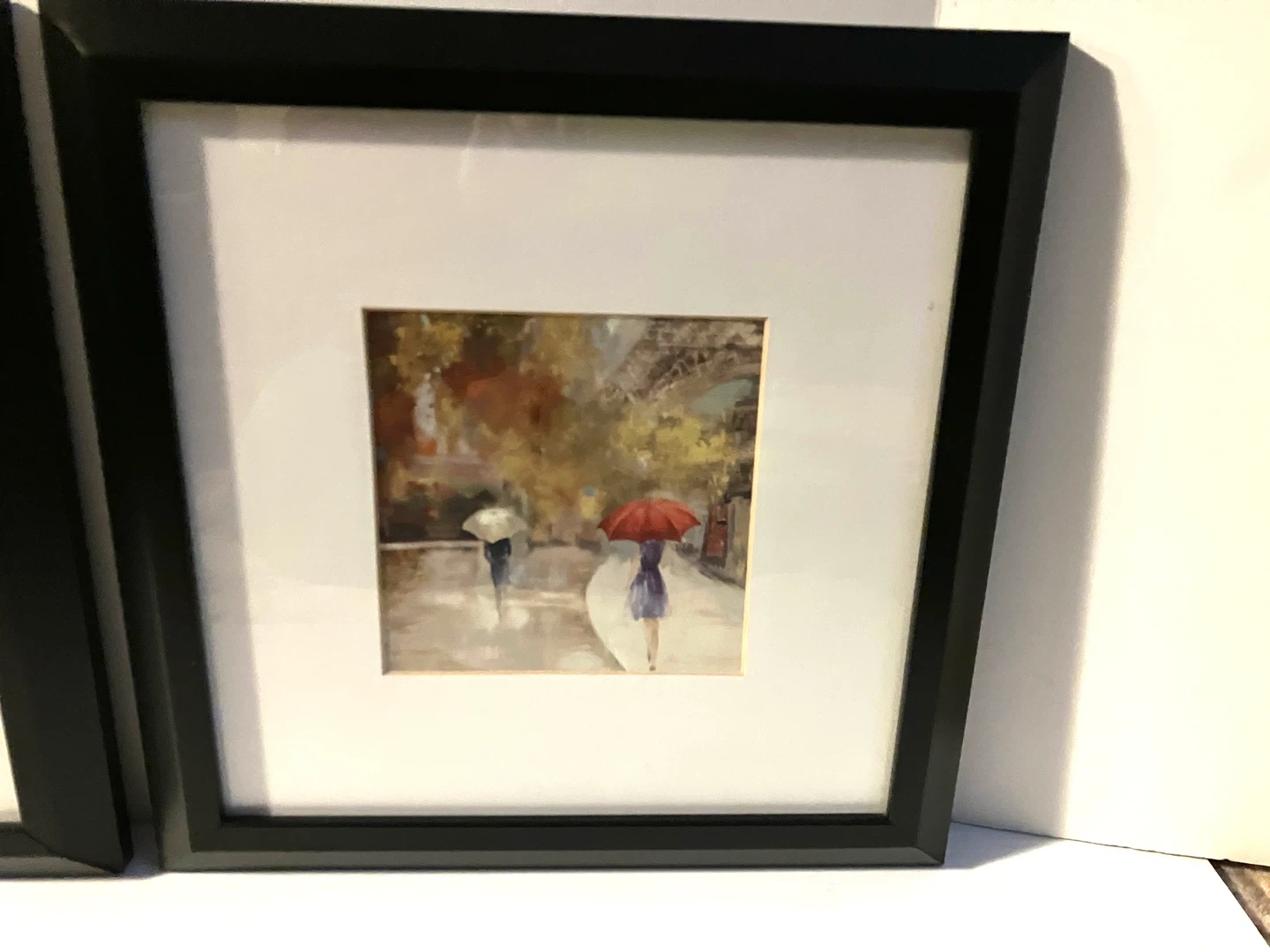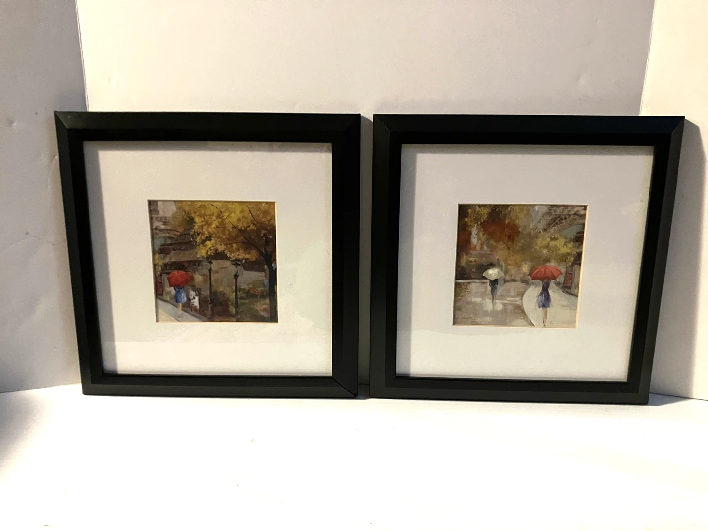 Two framed art prints depicting Parisian scenes with people under umbrellas. Black frames. Simple, charming decor pieces!