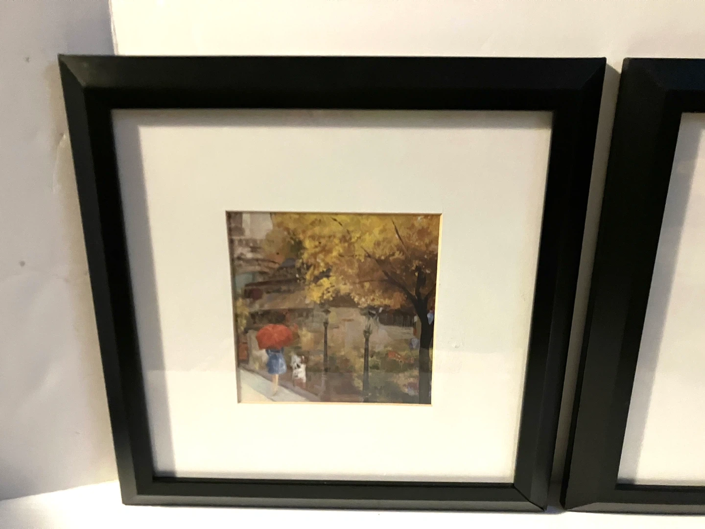 Two framed art prints depicting Parisian scenes with people under umbrellas. Black frames. Simple, charming decor pieces!