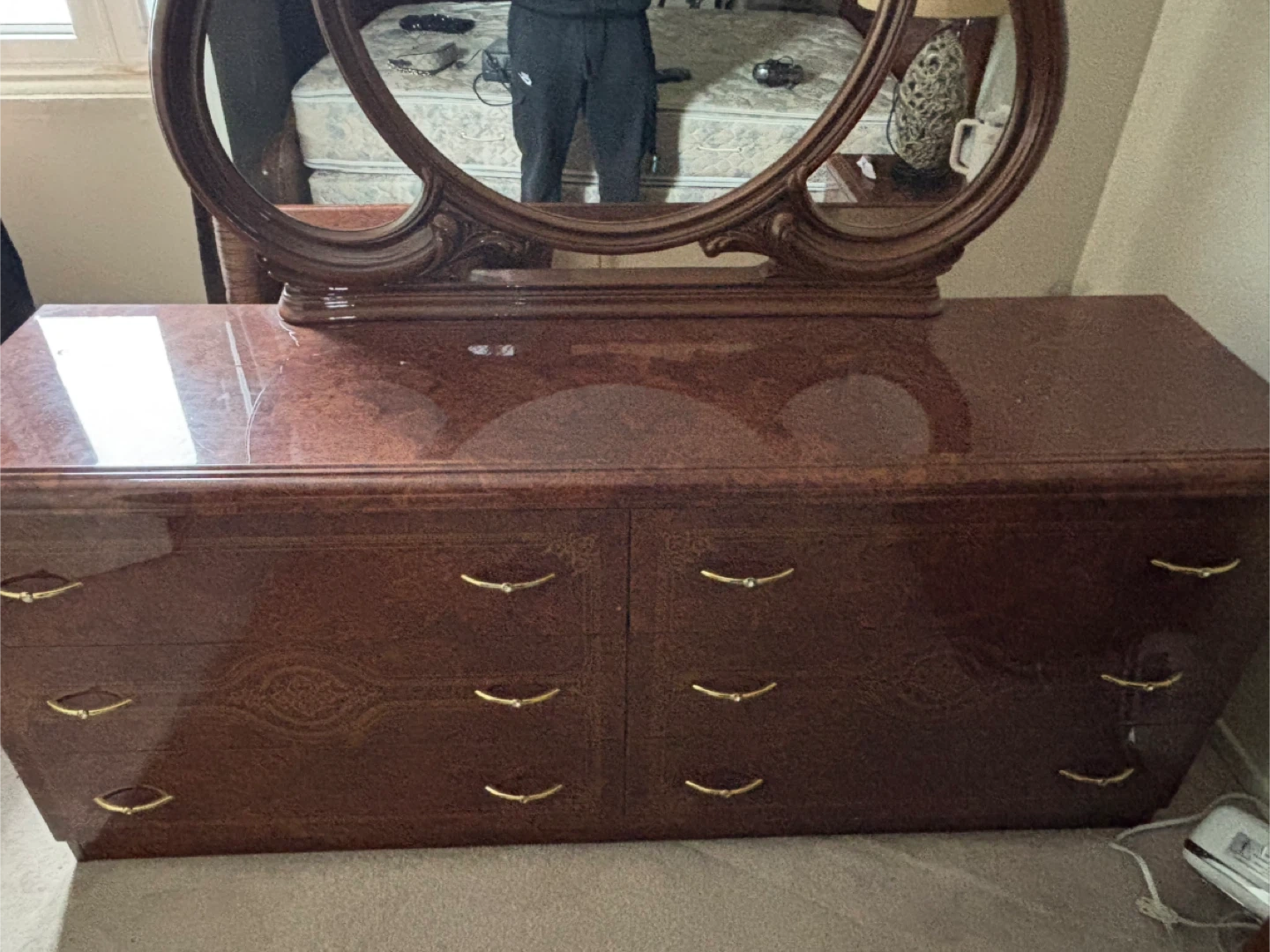 Beautiful dark wood dresser with attached mirror. Classic vintage look with detailed woodwork. Lots of drawer space.