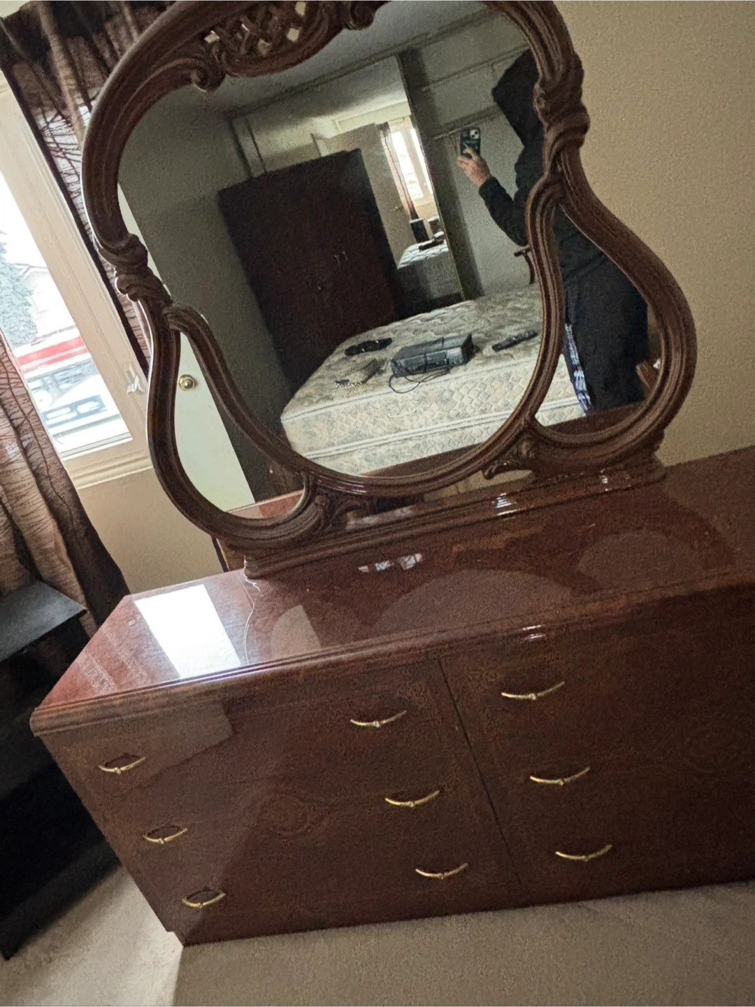 Beautiful dark wood dresser with attached mirror. Classic vintage look with detailed woodwork. Lots of drawer space.