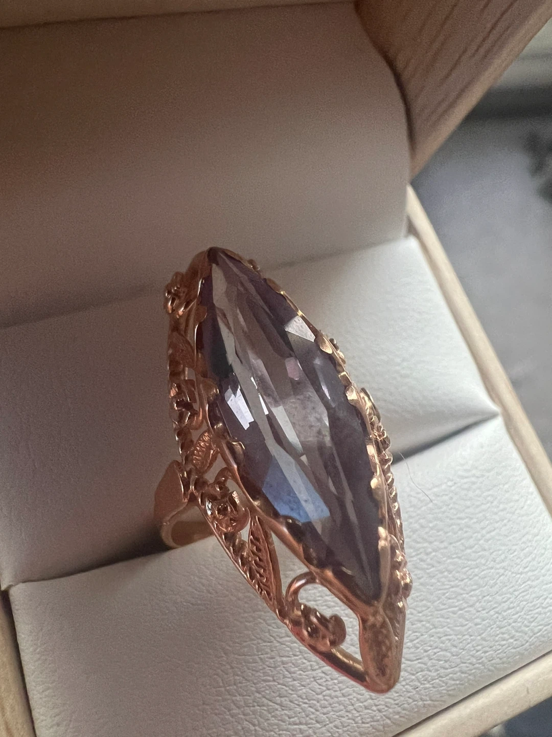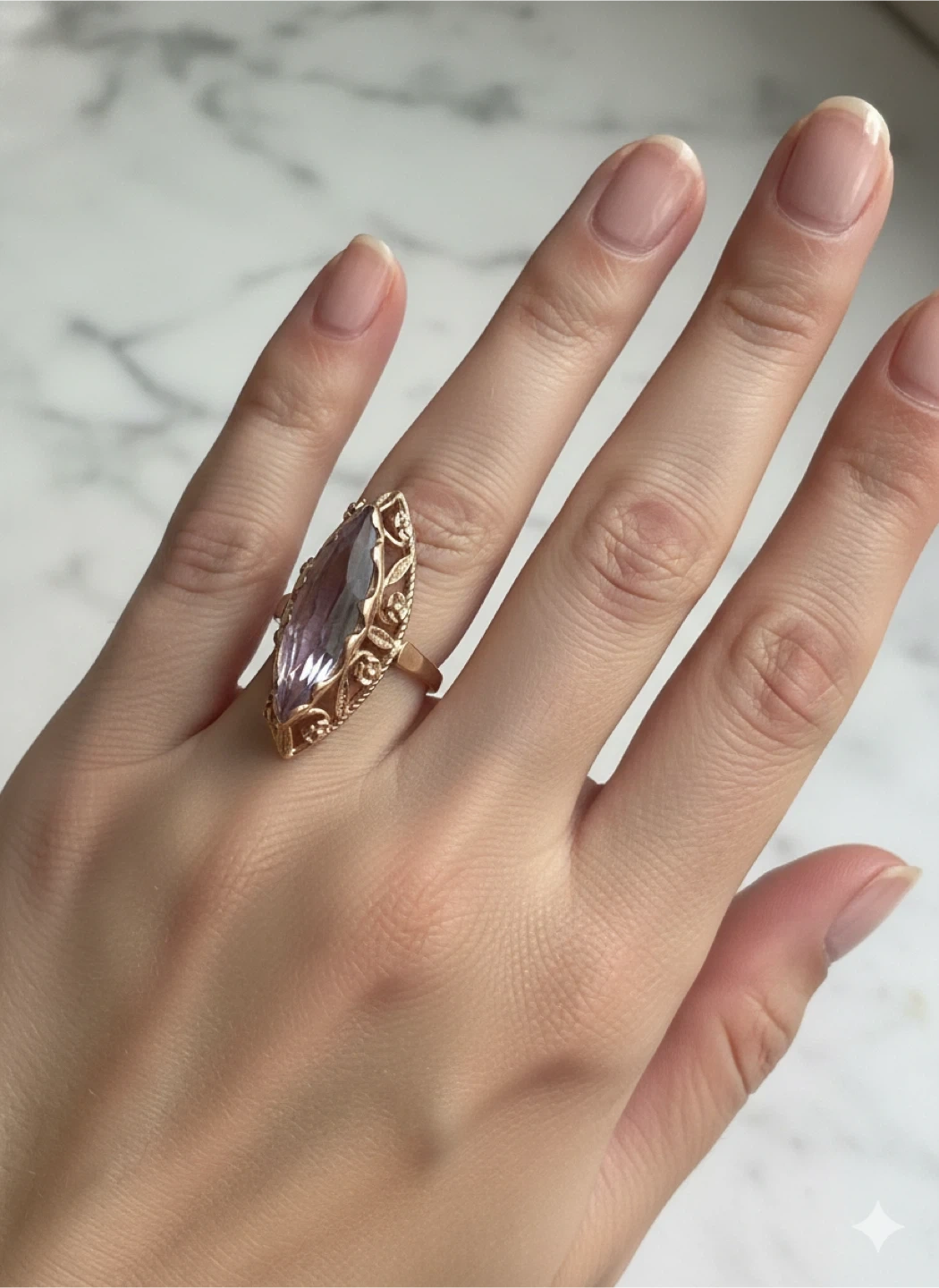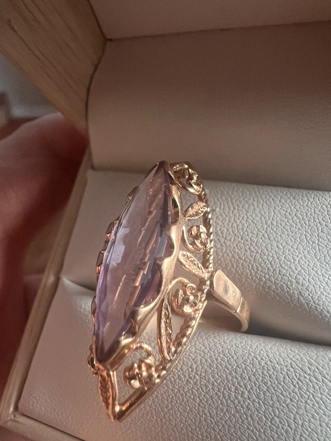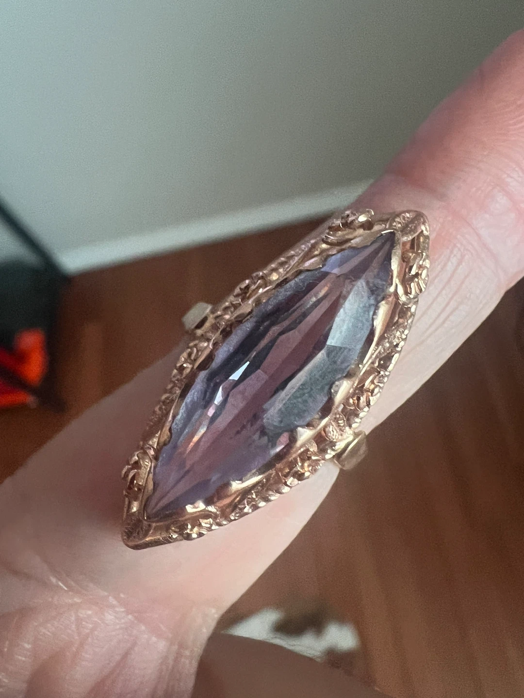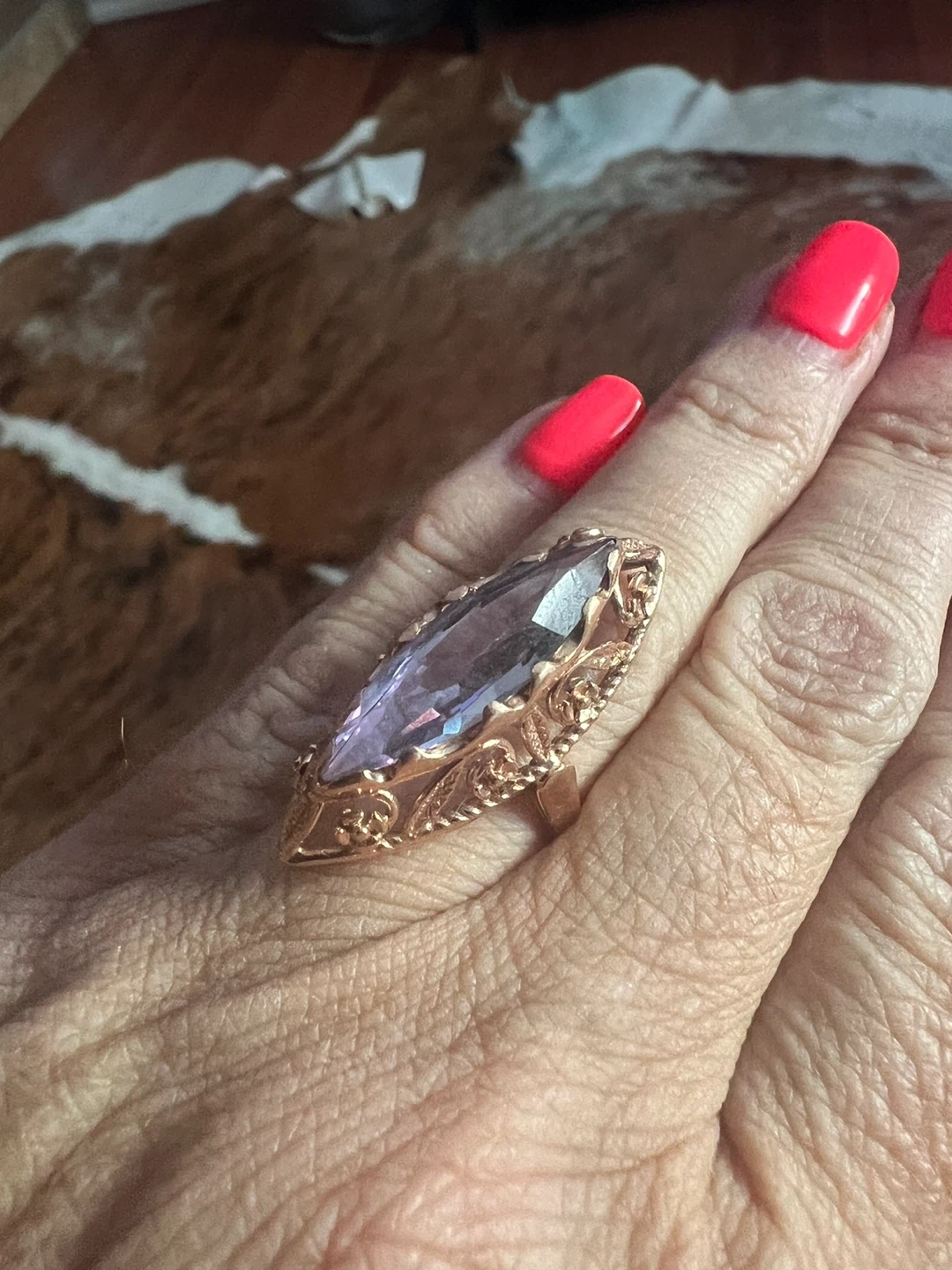 Stunning 14 k vintage ring featuring a large, marquise-cut amethyst. It's set in an intricately detailed rose gold-tone metal. This statement piece would make a lovely addition to any jewellery collection. It's eye-catching and elegant!