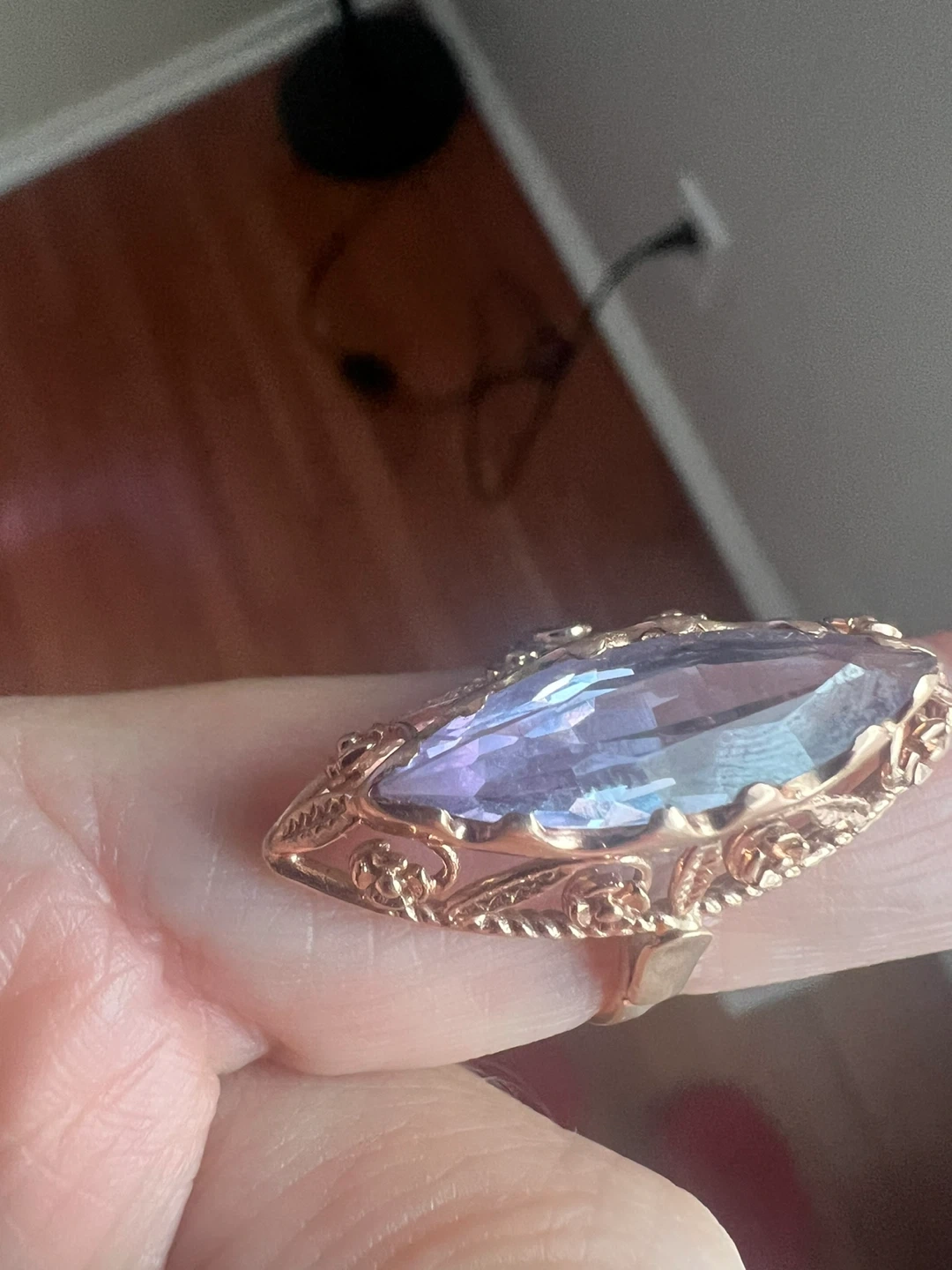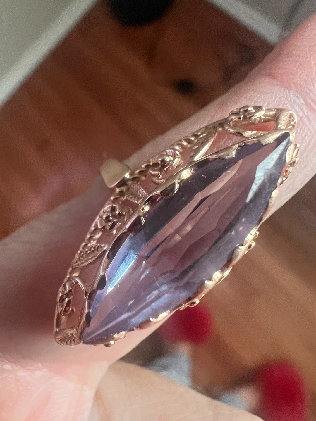 Stunning 14 k vintage ring featuring a large, marquise-cut amethyst. It's set in an intricately detailed rose gold-tone metal. This statement piece would make a lovely addition to any jewellery collection. It's eye-catching and elegant!