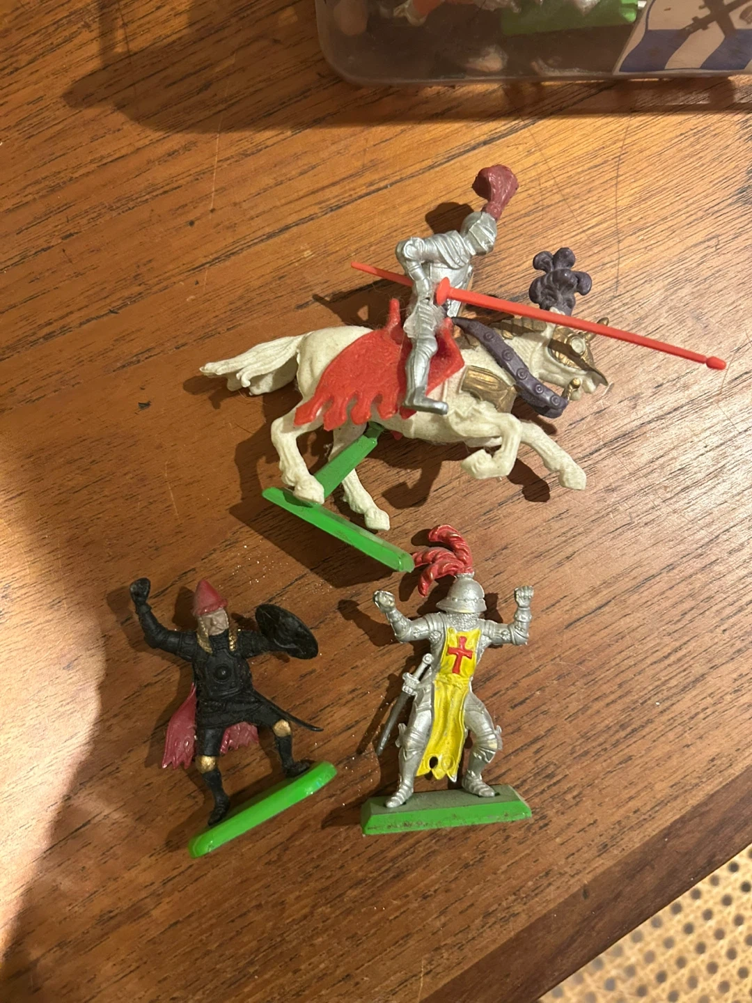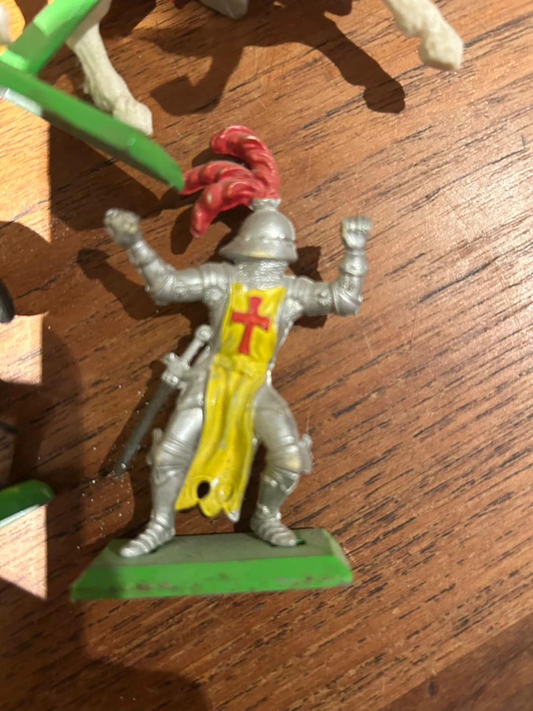 Set of three Britains Ltd toy knights from 1971. Figures include one knight on horseback and two foot soldiers. Made in England. These are great for collectors or imaginative play!