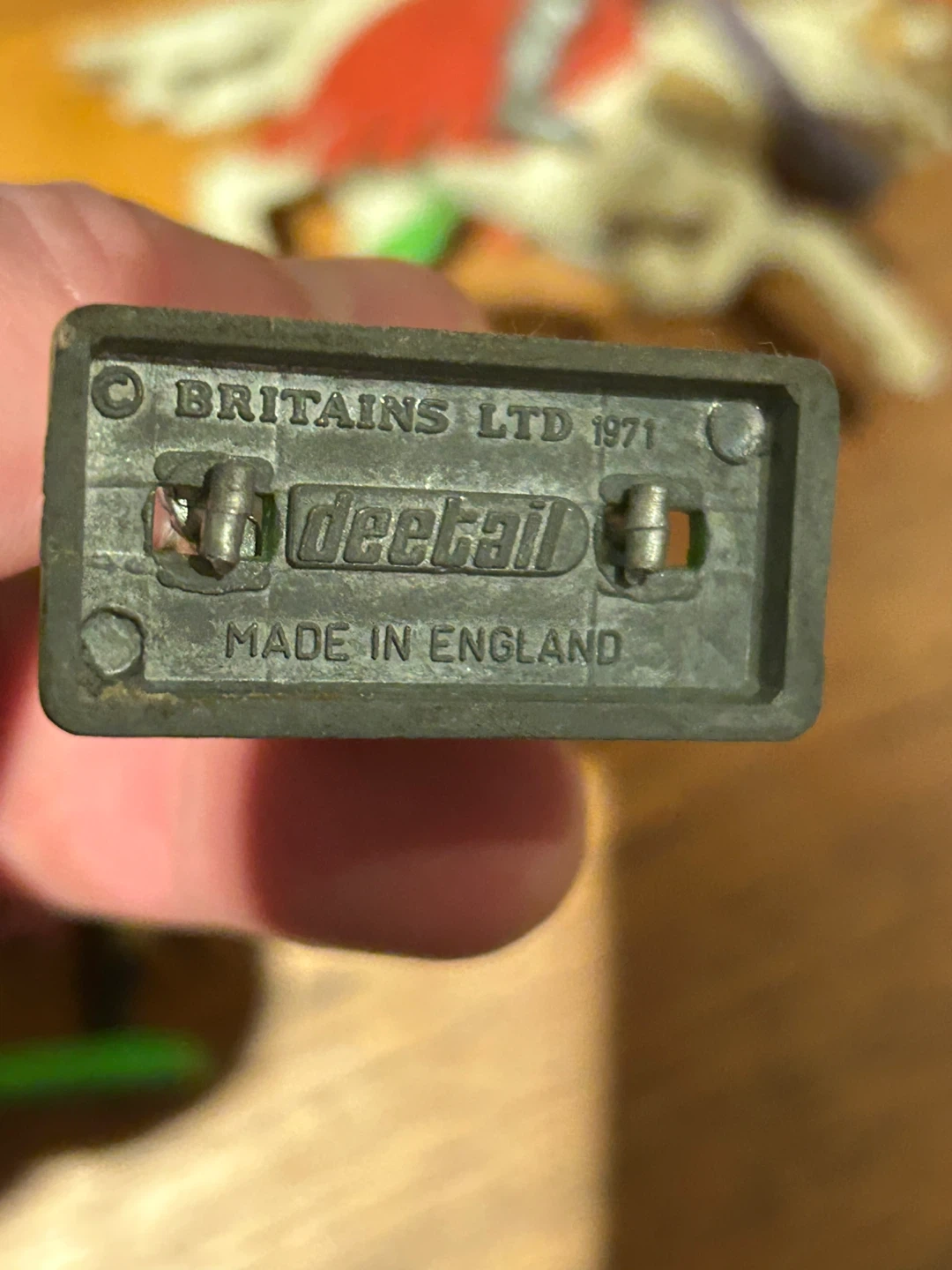 Set of three Britains Ltd toy knights from 1971. Figures include one knight on horseback and two foot soldiers. Made in England. These are great for collectors or imaginative play!