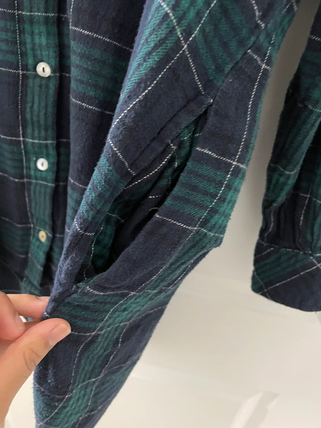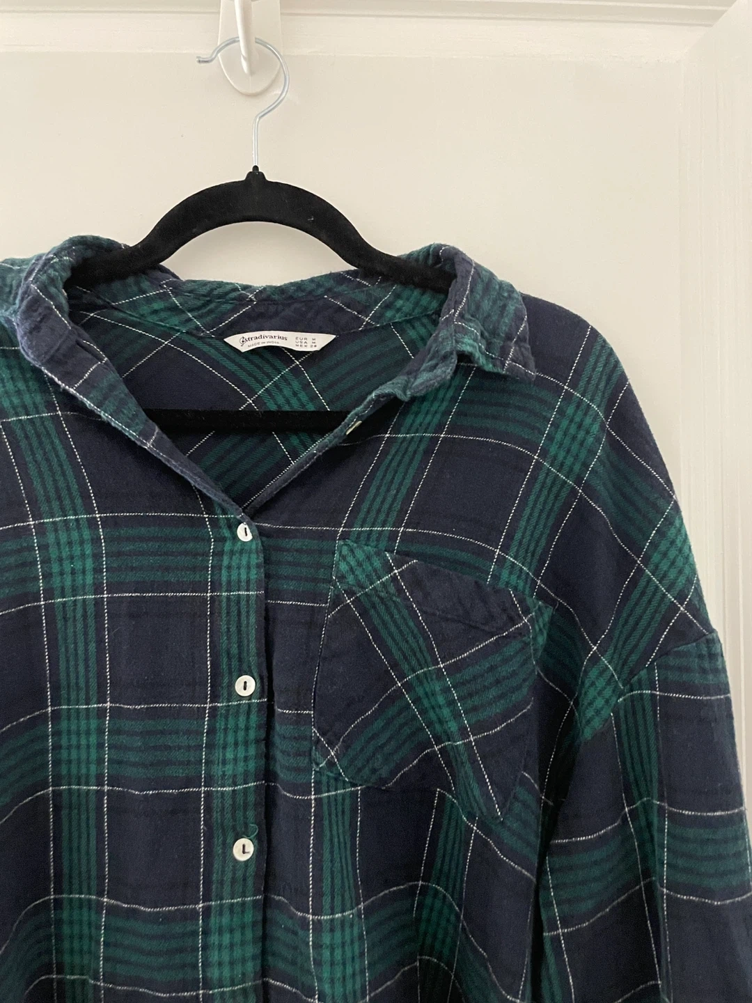 Classic navy and green plaid long length button-up shirt from Stradivarius. Features shell-like buttons, and two deep side pockets.