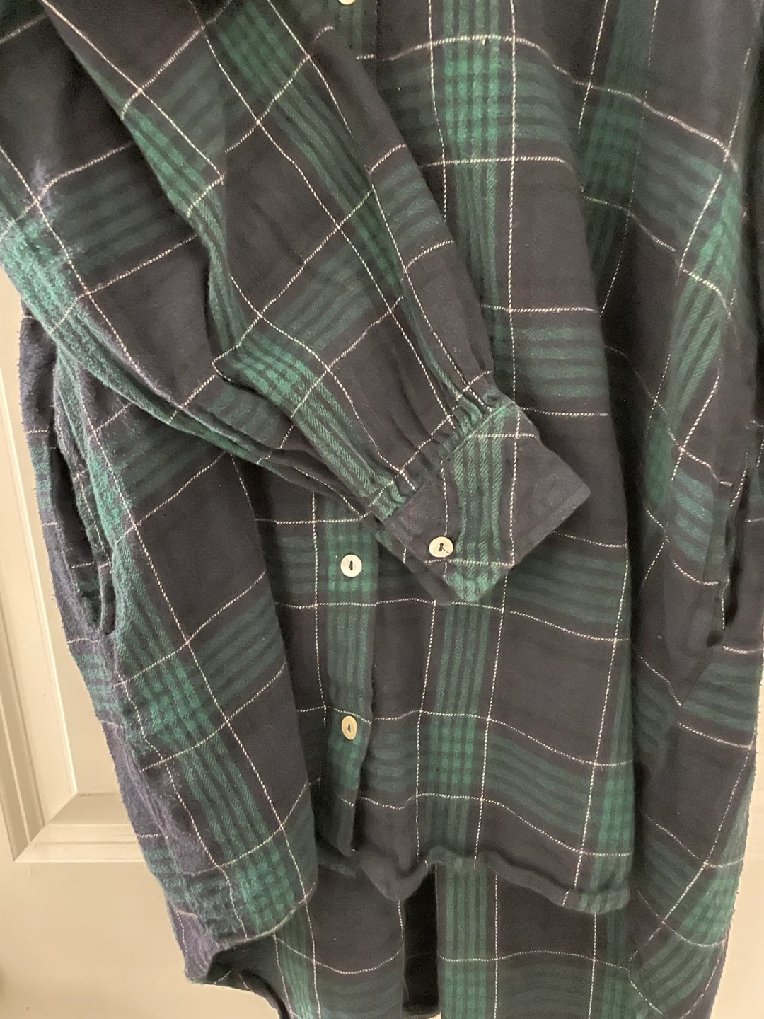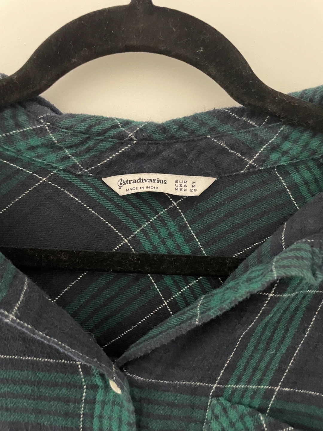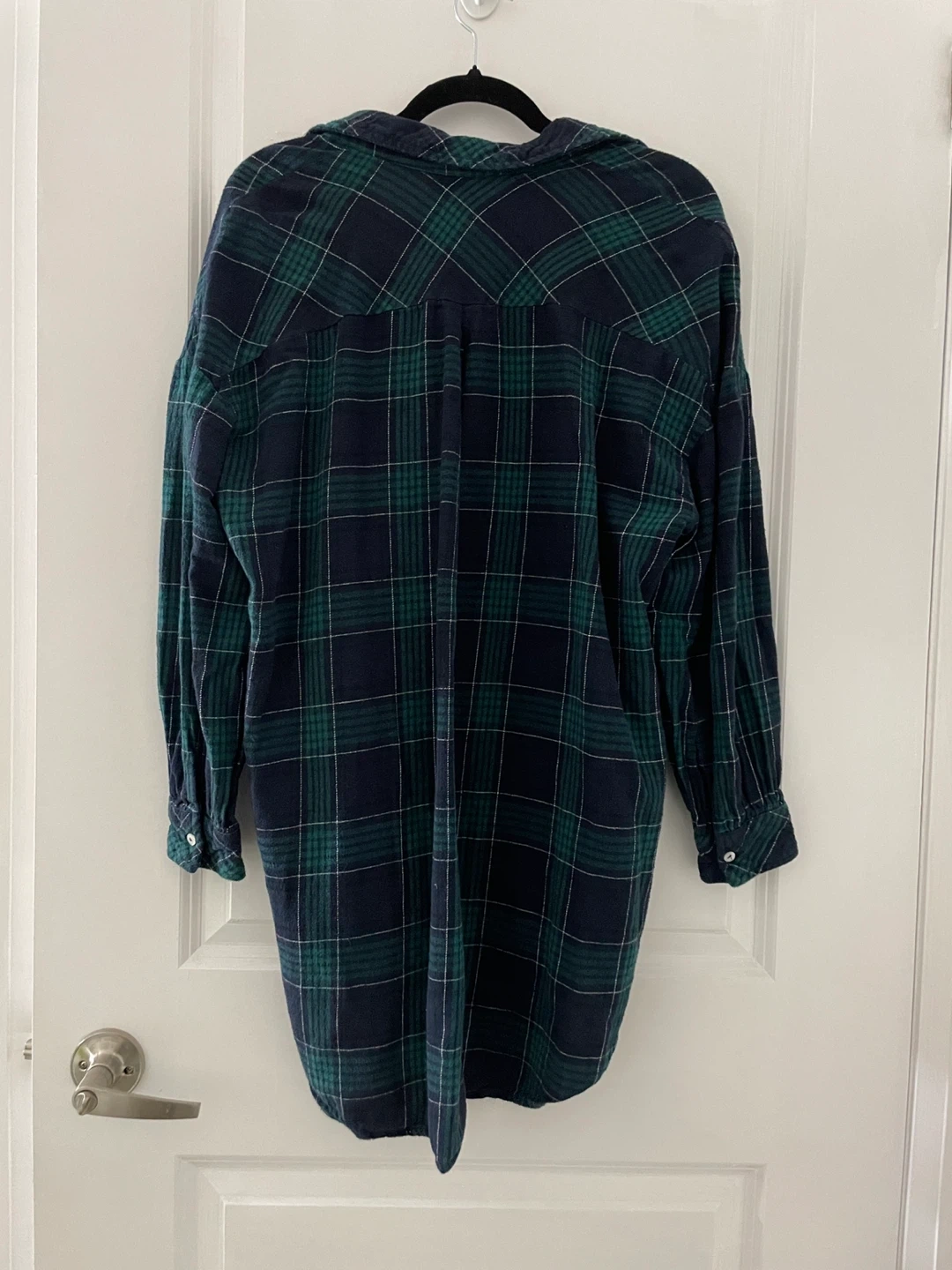 Classic navy and green plaid long length button-up shirt from Stradivarius. Features shell-like buttons, and two deep side pockets.