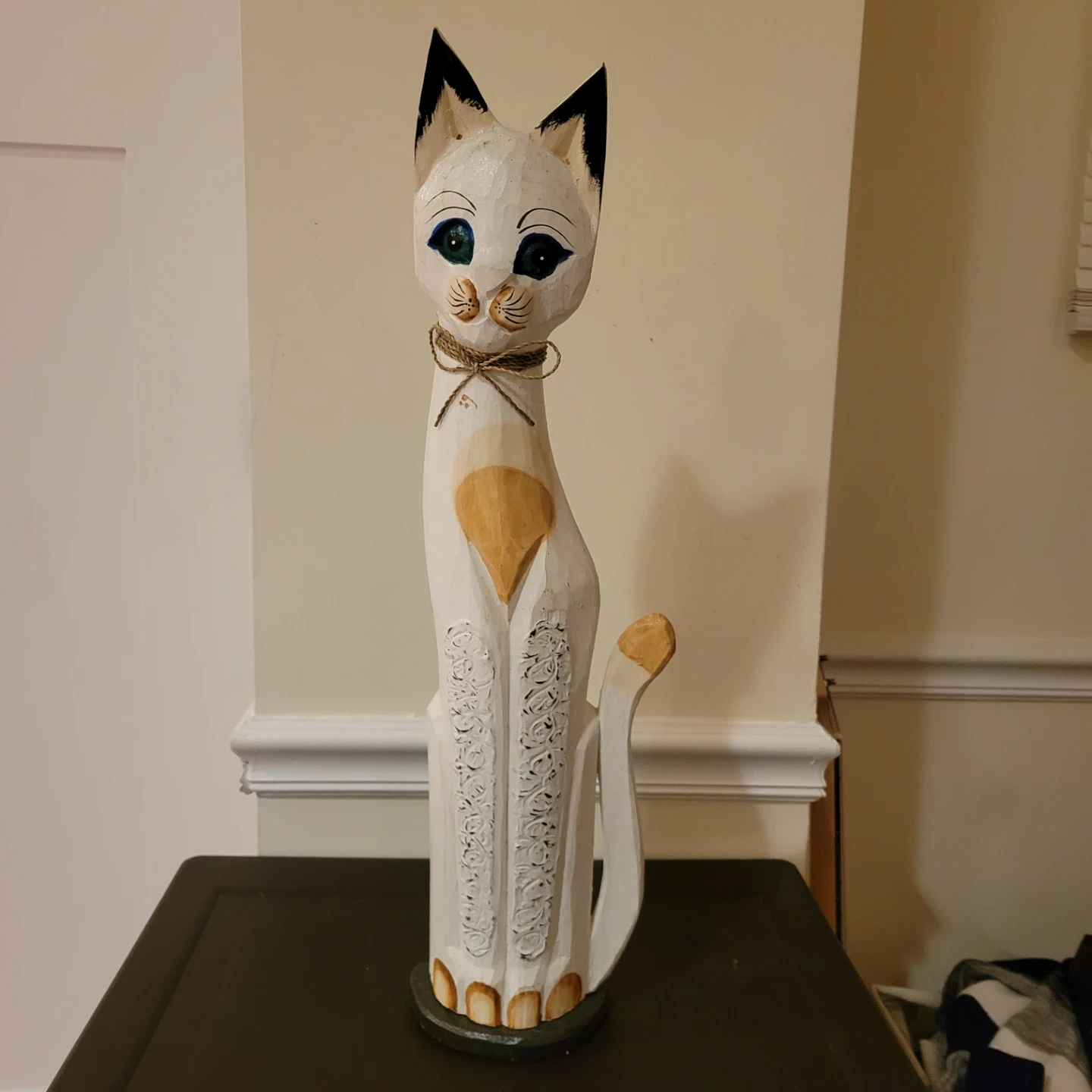 This charming wooden cat figurine is hand-carved and painted white with orange and black accents. It features decorative carvings on its front and a twine bow around its neck. Its unique design makes it a lovely decorative piece for any home!